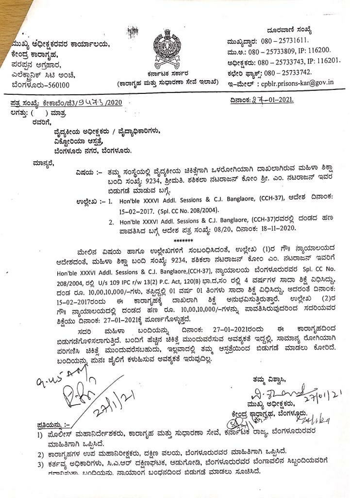 ಆದರೆ ಕೋವಿಡ್ ಸೋಂಕು ಹಿನ್ನಲೆಯಲ್ಲಿ ಇನ್ನು ನಾಲ್ಕೈದು ದಿನಗಳ ಕಾಲ ವಿಕ್ಟೋರಿಯಾ ಆಸ್ಪತ್ರೆಯಲ್ಲಿ ಚಿಕಿತ್ಸೆ ಪಡೆಯಲಿದ್ದಾರೆ. ಜೈಲಿನಿಂದ ಅಧಿಕೃತ ಬಿಡುಗಡೆಯಾಗುತ್ತಿರುವುದರಿಂದ ಜೈಲು ಅಧಿಕಾರಿಗಳು ಆಸ್ಪತ್ರೆಗೆ ಭೇಟಿ ನೀಡಿ ಔಪಚಾರಿಕವಾಗಿ ಶಶಿಕಲಾ ಅವರಿಂದ ಇಂದು ಸಹಿ ಪಡೆದಿದ್ದಾರೆ ಎಂದು ಆಸ್ಪತ್ರೆ ಮೂಲಗಳು ತಿಳಿಸಿವೆ.