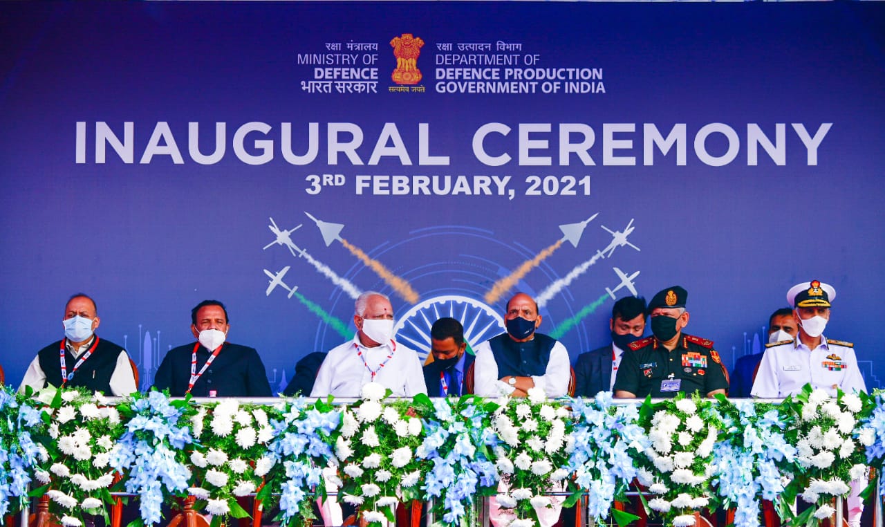 ಉದ್ಘಾಟನೆ ಕಾರ್ಯಕ್ರಮದಲ್ಲಿ ರಾಷ್ಟ್ರಧ್ವಜ, ಭಾರತೀಯ ವಾಯುಸೇನೆ ಹಾಗೂ ಏರೊ ಇಂಡಿಯಾ 2021 ಧ್ವಜ ಹೊತ್ತು ಹಗುರ ಯುದ್ಧ ಹೆಲಿಕಾಪ್ಟರ್ ಗಳು ಆಕರ್ಷಕವಾಗಿ ನೀಲಾಕಾಶದಲ್ಲಿ ಗಾಂಭೀರ್ಯದಿಂದ ಸಾಗಿದವು.