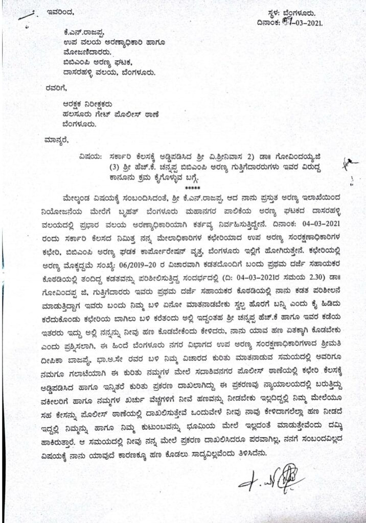 “ಇದಕ್ಕೆ ನಾನು ಒಪ್ಪದಿದ್ದಾಗ ನಿಮ್ಮ ಮೇಲೆ ಪೊಲೀಸ್ ಠಾಣೆಯಲ್ಲಿ ಕೇಸು ದಾಖಲಿಸುತ್ತೇನೆಂದು ಅವಾಚ್ಯವಾಗಿ ನಿಂದಿಸಿ, ಜೀವ ಬೆದರಿಕೆ ಹಾಕಿದರು. ಸಾರ್ವಜನಿಕರ ಮುಂದೆಯೇ ಗಲಾಟೆ ಮಾಡಿ, ಎಳೆದಾಡಿ ಹೊಡೆಯಲು ಮುಂದೆ ಬಂದಿದ್ದರು. ಅಲ್ಲದೆ ಸರ್ಕಾರಿ ಕೆಲಸಕ್ಕೆ ಅಡ್ಡಿಪಡಿಸಿದರು. ಇವರ ವಿರುದ್ಧ ಸೂಕ್ತ ಕಾನೂನು ಕ್ರಮ ಕೈಗೊಳ್ಳಿ” ಎಂದು ಡಿಆರ್ ಎಫ್ ಒ ರಾಜಪ್ಪ ಲಿಖಿತ ದೂರು ನೀಡಿದ್ದಾರೆ.