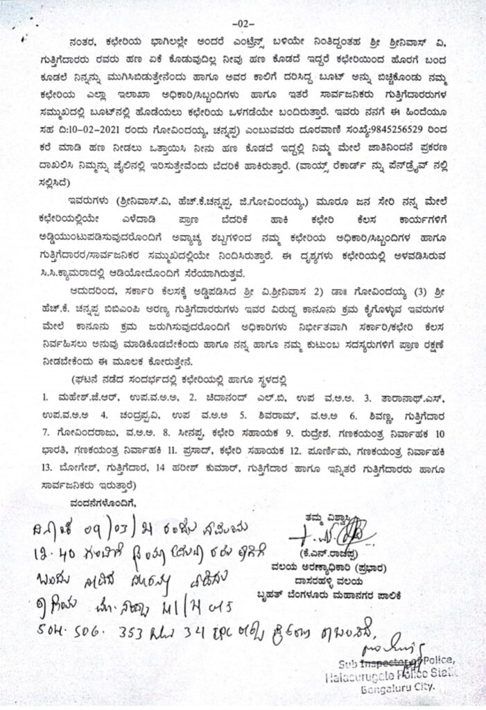 ಅಲ್ಲದೆ ಫೆಬ್ರವರಿ 10ರಂದು ಸದಾಶಿವನಗರ ಪೊಲೀಸ್ ಠಾಣೆಯಲ್ಲಿ ದೂರಿನ ಪ್ರಕರಣದ ಸಂಬಂಧ ನ್ಯಾಯಾಲಯದ ಕರ್ಚಿಗೆ ಹಣ ನೀಡುವಂತೆ ಕರೆ ಮಾಡಿ ಒತ್ತಾಯಿಸಿದ್ದರು. ಹಣ ನೀಡದಿದ್ದಲ್ಲಿ ಜಾತಿನಿಂದನೆ ಕೇಸ್ ದಾಖಲಿಸುವುದಾಗಿ ಬೆದರಿಸಿದ್ದರು. ಈ ಕುರಿತ ಕರೆ ಸಂಭಾಷಣೆಯ ವಾಯ್ಸ್ ರೆಕಾರ್ಡ್ ಸಾಕ್ಷಿಯನ್ನು ದೂರಿನೊಂದಿಗೆ ಸಲ್ಲಿಸಿರುವುದಾಗಿ ತಿಳಿಸಿದ್ದಾರೆ.