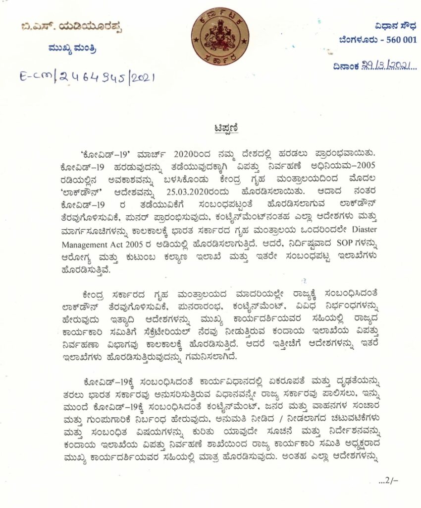ಇನ್ನೊಂದೆಡೆ ಕೋವಿಡ್ ಕಠಿಣ ಕಾನೂನು ಜಾರಿ, ನಿರ್ಬಂಧ ತೆರವು ಅಥವಾ ವಿಧಿಸುವಿಕೆಯನ್ನು ಯಾವ ಸಚಿವರು ಅಥವಾ ಇಲಾಖೆಗಳಾಗಲಿ ಆದೇಶ ಹೊರೆಡಿಸುವಂತಿಲ್ಲ ಎಂದು ಮುಖ್ಯಮಂತ್ರಿ ಬಿ.ಎಸ್.ಯಡಿಯೂರಪ್ಪ ಸೋಮವಾರ ಪತ್ರ ಬರೆದು ಖಡಕ್ ಎಚ್ಚರಿಕೆ ನೀಡಿದ್ದಾರೆ.