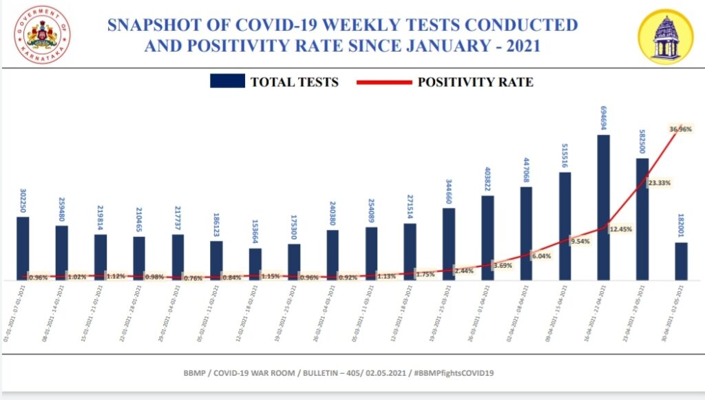 ಬೆಂಗಳೂರಿನಲ್ಲಿ ಕೋವಿಡ್ ಸೋಂಕು ಪರೀಕ್ಷೆ ಮಾಡಿಸಿಕೊಳ್ಳುವವರ ಸಂಖ್ಯೆಯು ಒಂದೇ ಸಮನೆ ಏರಿಕೆಯಾಗುತ್ತಿದೆ. 2020ರ ಮಾರ್ಚ್ ತಿಂಗಳಲ್ಲಿ ಕೇವಲ 1,169 ಮಂದಿ ಮಾತ್ರ ಕೋವಿಡ್ ಪರೀಕ್ಷೆ ಮಾಡಿಸಿದ್ದರು. ಇದಾದ ಬಳಿಕ ಕಳೆದ 14 ತಿಂಗಳಲ್ಲಿಯೇ ಏಪ್ರಿಲ್ 2021ರಲ್ಲಿ ಬರೋಬ್ಬರಿ 23.57 ಲಕ್ಷ ಮಂದಿ ಕೋವಿಡ್ ಟೆಸ್ಟ್ ಮಾಡಿಸಿಕೊಂಡಿದ್ದಾರೆ. ಆ ಪೈಕಿ 3,38,360 ಜನರಿಗೆ ಕೋವಿಡ್ ಪಾಸಿಟಿವ್ ಬಂದಿದೆ. ಏಪ್ರಿಲ್ 16ರ ವಾರದ ಕ್ರೋಢೀಕೃತ ಮಾಹಿತಿಯಂತೆ ಪಾಸಿಟಿವ್ ರೇಟ್ ಶೇಕಡ 12.45ರಷ್ಟಿತ್ತು. ಆದ್ರೆ ಏಪ್ರಿಲ್ 30ರಿಂದ ಮೇ 2ರ ತನಕದ 3 ದಿನದಲ್ಲಿ ಒಟ್ಟು 1,82,001 ಜನರು ಕೋವಿಡ್ ಟೆಸ್ಟ್ ಮಾಡಿಸಿದ್ದು, ಆ ಪೈಕಿ ಶೇಕಡ 36.96ರಷ್ಟು ಮಂದಿಗೆ ಪಾಸಿಟಿವ್ ಬಂದಿದೆ. ಇದರಿಂದ ಪಾಸಿಟಿವ್ ರೇಟ್ ಕೂಡ ಹೆಚ್ಚಾಗುತ್ತಿರುವುದು ಕಂಡು ಬಂದಿದೆ.