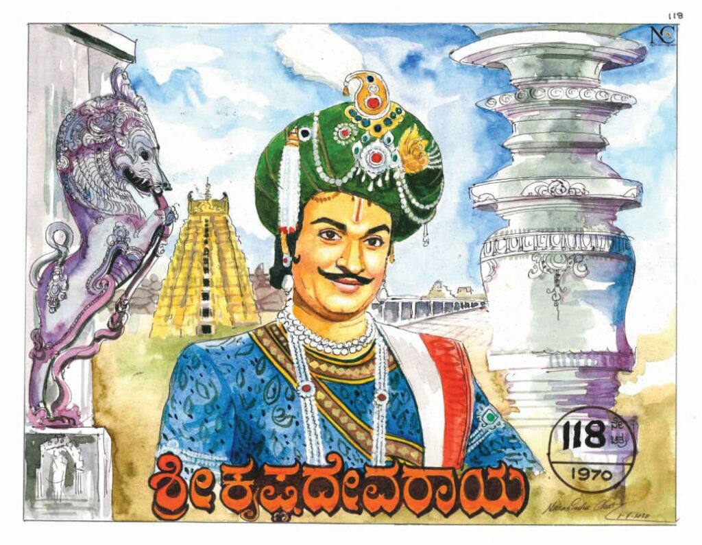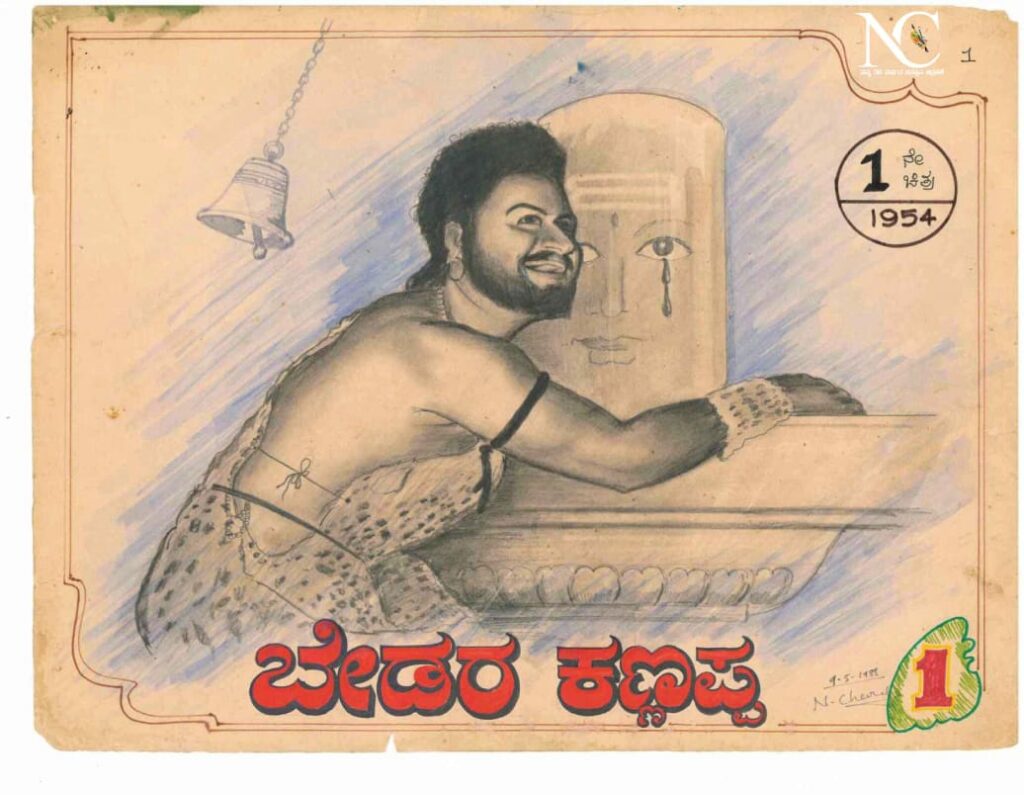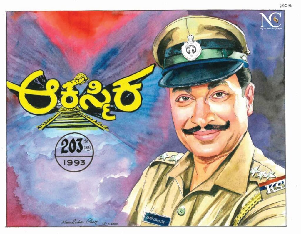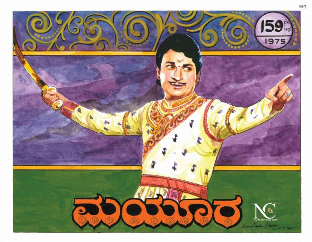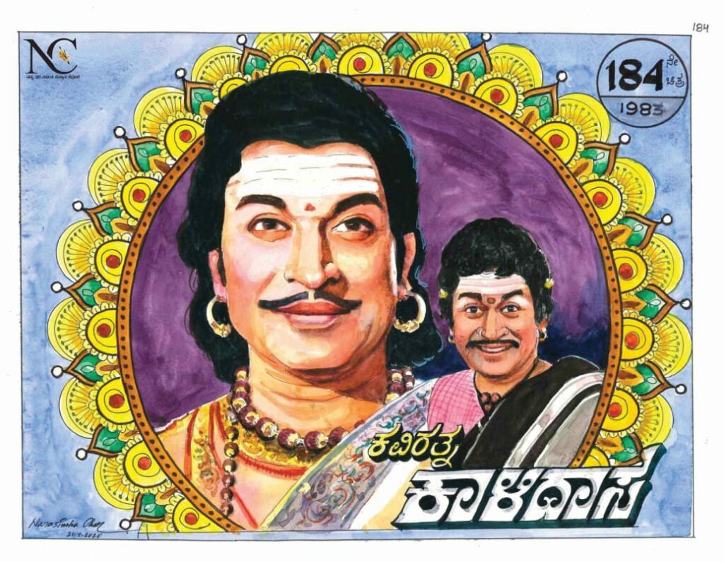 ಈ ಕಾರಣಕ್ಕೆ ನರಸಿಂಹ ಆಚಾರ್, ಅವರು ಡಾ.ರಾಜ್ ಕುಮಾರ್ ಹೆಸರು, ಕನ್ನಡ ಎಂಬ ಅಡಿಬರಹ ಬರೆದು, ಅದರ ಮೇಲ್ಭಾಗದಲ್ಲಿ ಆಲದ ಮರದ ಕಾಂಡದಲ್ಲಿ ಸೂಕ್ಷ್ಮವಾಗಿ ಕರ್ನಾಟಕದ ನಕ್ಷೆ, ಅದರ ಮುಂಭಾಗ ತಾಯಿ ಭುವನೇಶ್ವರಿಯನ್ನು ಚಿತ್ರಿಸಿದ್ದಾರೆ. ಆ ದೇವಿಯ ಎದುರು, ಕ್ಯಾಮರಾ ಮುಂದೆ ನಟ- ನಟಿಯರಿಬ್ಬರು ಅಭಿನಯಿಸುವ ದೃಶ್ಯವನ್ನು ತಮ್ಮ ರೇಖೆಯಲ್ಲಿ ಹಿಡಿದಿಟ್ಟಿದ್ದಾರೆ.