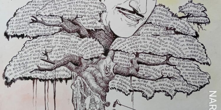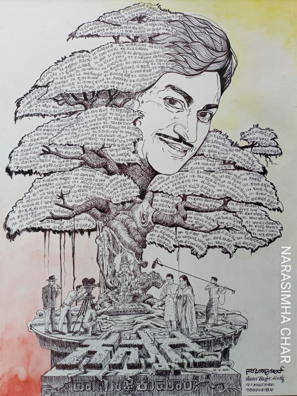 ಪದ್ಮಭೂಷಣ ಡಾ.ರಾಜ್ ಅವರ ನಟನೆಯ ಬೇಡರ ಕಣ್ಣಪ್ಪ ಮೊದಲ ಸಿನಿಮಾ ದಿಂದ ಹಿಡಿದು, 205ನೇ ಚಿತ್ರ ಶಬ್ದವೇಧಿವರೆಗಿನ ಚಲನಚಿತ್ರದ ಹೆಸರುಗಳನ್ನು ಮರದ ಎಲೆಗಳ ಮಧ್ಯೆ ಹೆಸರಿಸುತ್ತಾ ಆ ಮಹಾನ್ ನಾಯಕನ ನಟನನ್ನು ಮಂಡ್ಯದ ನರಸಿಂಹ ಆಚಾರ್ ಎಂಬ ವ್ಯಕ್ತಿ ಹೇಗೆ ಚಿತ್ರಿಸಿದ್ದಾರೆ ನೋಡಿ.