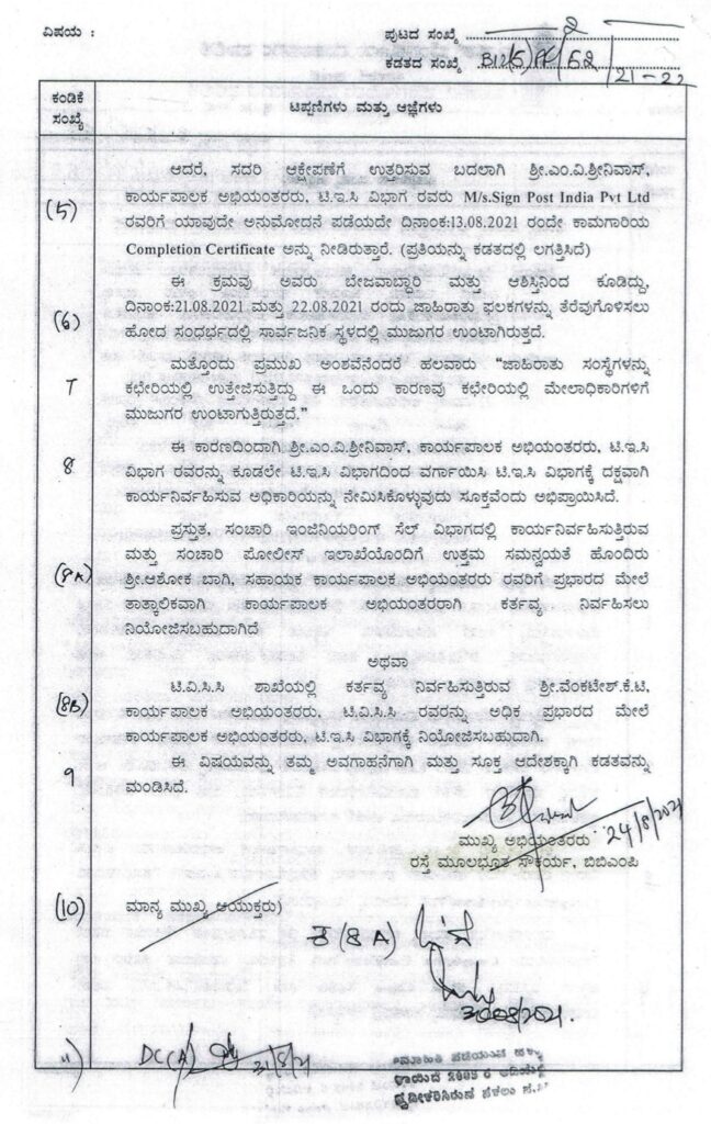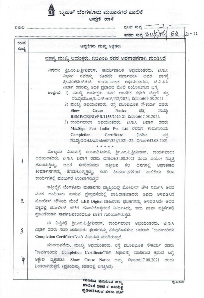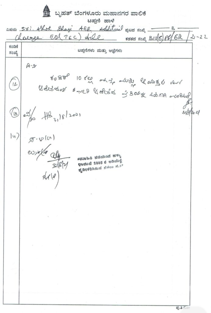 ಆದರೆ, ಈ ಪ್ರಕರಣದಲ್ಲಿ ಆಡಳಿತ ವಿಭಾಗದಿಂದ ಕಡತವು ಮಂಡನೆಯಾಗಿಲ್ಲ. ಬದಲಿಗೆ ರಸ್ತೆಗಳ ಮೂಲಭೂತ ಸೌಕರ್ಯಗಳ ಇಲಾಖೆಯ ಚೀಫ್ ಎಂಜಿನಿಯರ್ ಪ್ರಹ್ಲಾದ್ ತಮ್ಮ ಪರಮ ಶಿಷ್ಯ ಅಶೋಕ್ ಬಾಗಿಯನ್ನ ಕರೆತರಲು ಸ್ವತಃ ತಾವೇ ತಯಾರಿಸಿದ ಟಿಪ್ಪಣಿ ಹಾಳೆಗಳ ಕಡತವನ್ನು ನೇರವಾಗಿ ತೆಗೆದುಕೊಂಡು ಮುಖ್ಯ ಆಯುಕ್ತರ ಬಳಿ ಅನುಮೋದನೆ ಪಡೆದಿದ್ದಾರೆ. ಇದು ಹಲವಾರು ಅನುಮಾನಗಳಿಗೆ ಮತ್ತು ಮುಖ್ಯ ಆಯುಕ್ತರ ಕಾನೂನು ಬಾಹಿರ ನಡೆಗೆ ಪ್ರಮುಖ ಸಾಕ್ಷಿಯಾಗಿರುತ್ತದೆ ಎಂದು ಎನ್.ಆರ್.ರಮೇಶ್ ತಿಳಿಸಿದ್ದಾರೆ.