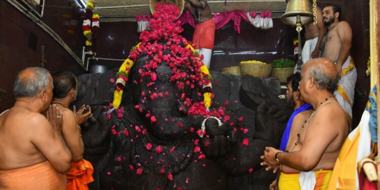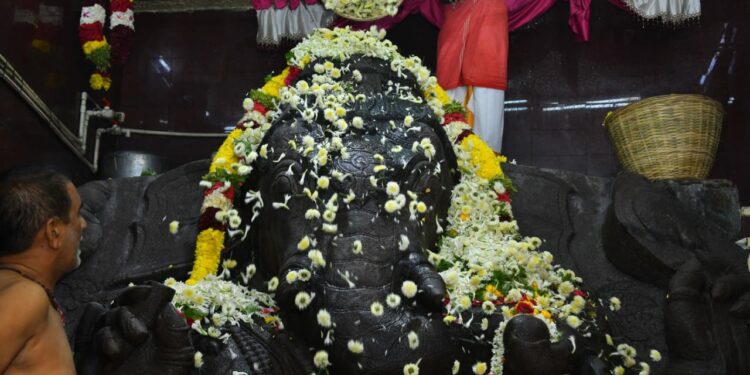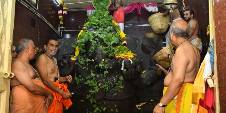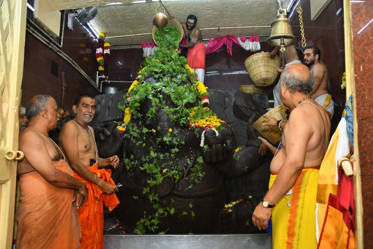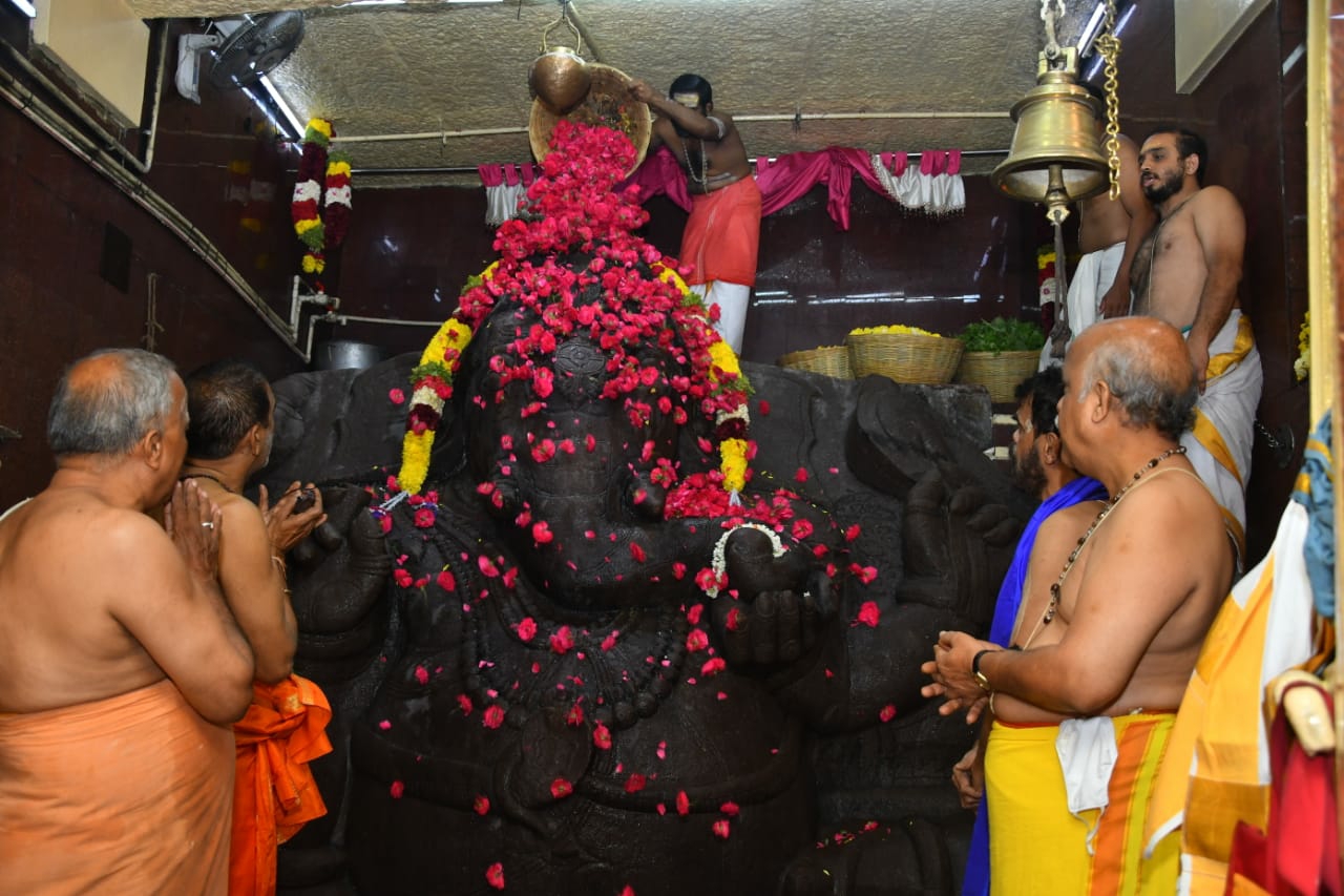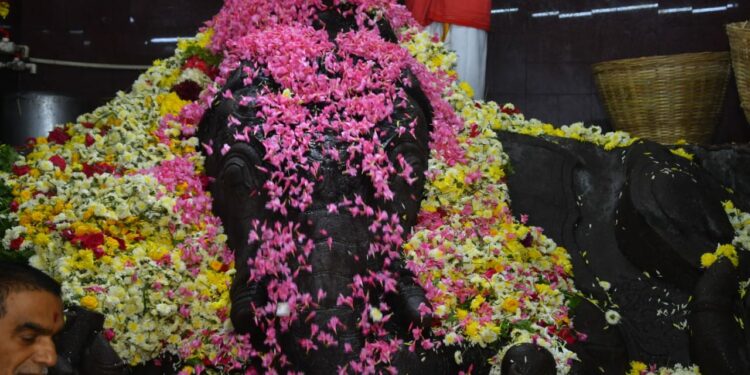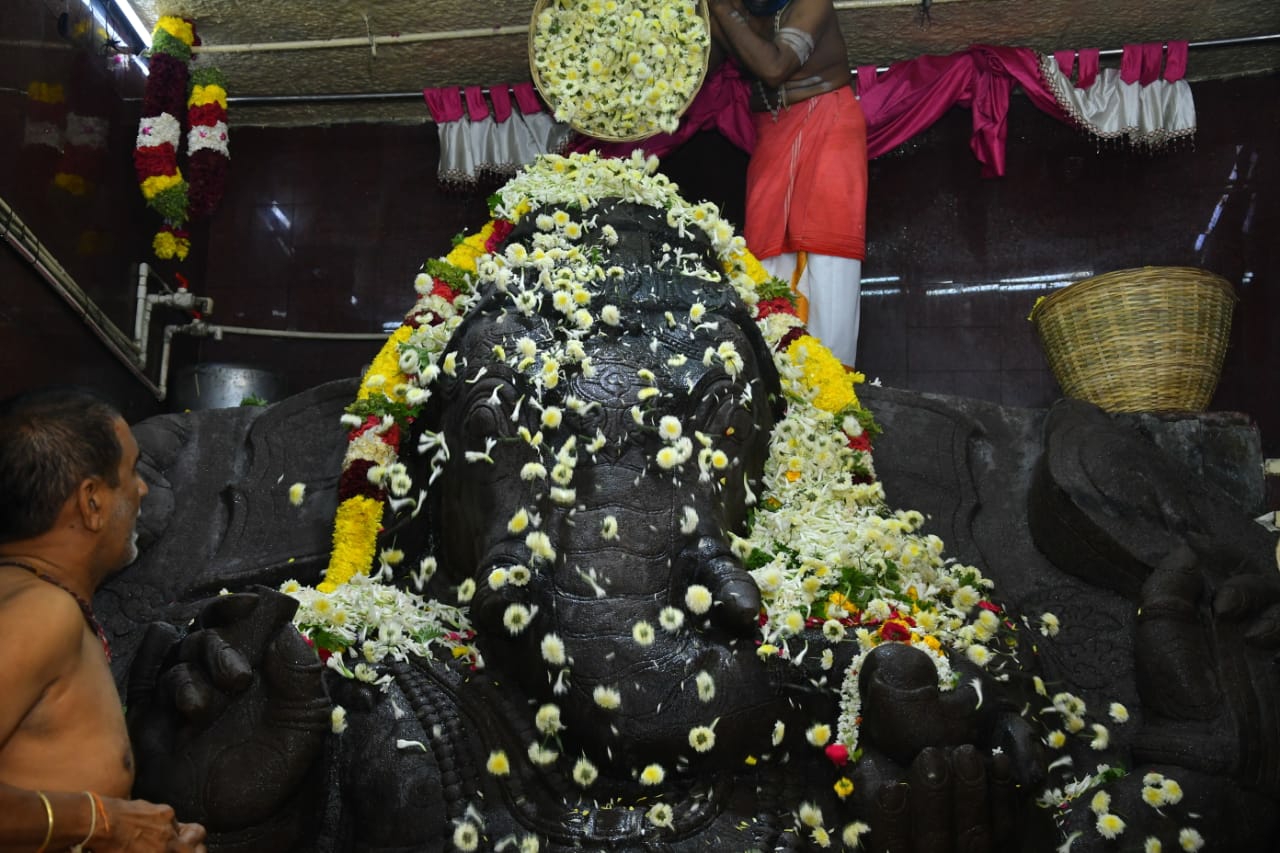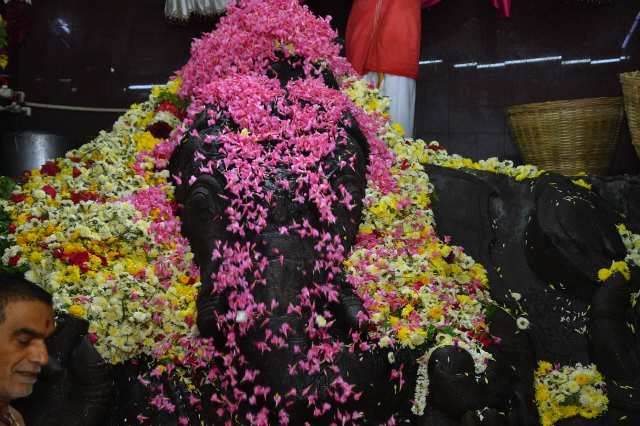 ಬೆಂಗಳೂರಿನ ಬಸವನಗುಡಿಯ ದೊಡ್ಡ ಗಣೇಶ ದೇವಸ್ಥಾನದಲ್ಲಿ ವಿಘ್ನ ವಿನಾಯಕನಿಗೆ ಭಕ್ತರು ನೀಡಿದ 12 ಕ್ಕೂ ಹೆಚ್ಚು ಬಗೆಯ 2 ಸಾವಿರ ಕೆ.ಜಿ. ಹೂವುಗಳಿಂದ ಅರ್ಚಕರು ಗುರುವಾರ ಶ್ರೀದೇವರಿಗೆ ಪುಷ್ಪವೃಷ್ಠಿಗೈದರು. ಭಕ್ತರು ಈ ಸಂದರ್ಭದಲ್ಲಿ ಉಪಸ್ಥಿತರಿದ್ದು ದೇವರ ದರ್ಶನ ಪಡೆದರು.
