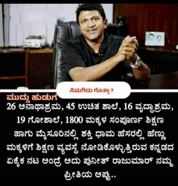 ಅಭಿಮಾನಿಗಳ ಪ್ರೀತಿಯ ಅಪ್ಪು ಎನಿಸಿಕೊಂಡಿರುವ ಪುನೀತ್ ರಾಜ್ ಕುಮಾರ್ ಸಾಮಾಜಿಕ ಕೆಲಸಗಳನ್ನು ಸದ್ದಿಲ್ಲದೆ ನಡೆಸಿಕೊಂಡು ಬರುತ್ತಿದ್ದರು. 26 ಅನಾಥಾಶ್ರಮ, 45 ಉಚಿತ ಶಾಲೆ, 16 ಗೋಶಾಲೆ, 1,800 ಮಕ್ಕಳ ಸಂಪೂರ್ಣ ಶಿಕ್ಷಣ ವ್ಯವಸ್ಥೆ ನೋಡಿಕೊಳ್ಳುತ್ತಿದ್ದಾರೆ. ಮೈಸೂರಿನಲ್ಲಿ ಶಕ್ತಿಧಾಮ ಹೆಸರಿನಲ್ಲಿ ಹೆಣ್ಣುಮಕ್ಕಳಿಗೆ ಶಿಕ್ಷಣ ವ್ಯವಸ್ಥೆ ಕಲ್ಪಿಸಿದ್ದರು ಎಂಬ ಮಾಹಿತಿ ಸಾಮಾಜಿಕ ಜಾಲತಾಣದಲ್ಲಿ ಹರಿದಾಡುತ್ತಿದೆ.