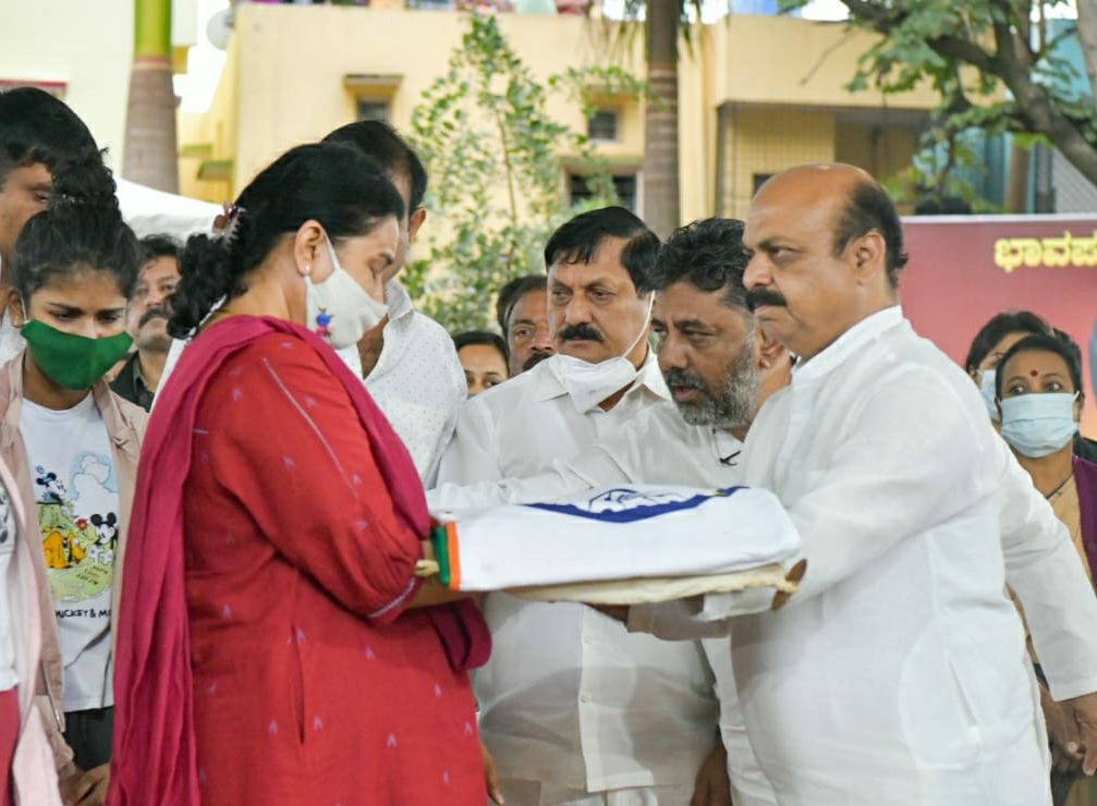ಪುನೀತ್ ಪತ್ನಿ ಅಶ್ವಿನಿಗೆ ಸಿಎಂ ಬೊಮ್ಮಾಯಿ ರಾಷ್ಟ್ರಧ್ವಜ ಹಸ್ತಾಂತರಿಸಿದರು.