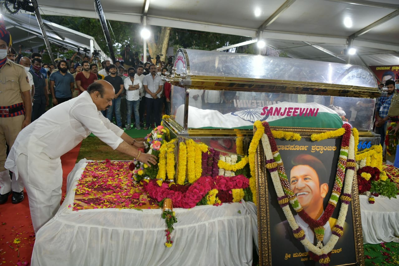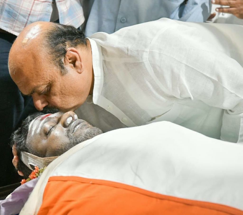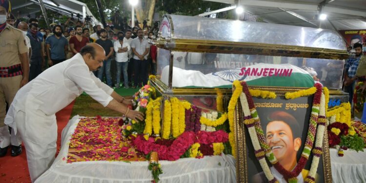 ಕೊನೆಯ ಬಾರಿಗೆ ಯುವರತ್ನನ ಹಣೆಗೆ ಭಾರವಾದ ಮನಸ್ಸುಗಳಿಂದ ಮುತ್ತಿಟ್ಟ ಸಿಎಂ ಬಸವರಾಜ ಬೊಮ್ಮಾಯಿ