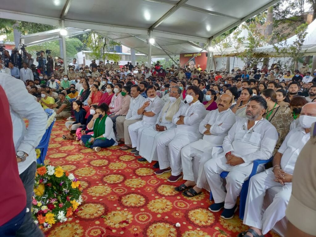ಮೊದಲು ಗಣ್ಯಾತಿ ಗಣ್ಯರು ಪುನೀತ್ ರಾಜಕುಮಾರ್ ಅವರ ಪಾರ್ಥಿವ ಶರೀರದ ಮೇಲೆ ಪುಷ್ಪ ಗುಚ್ಛ ಅರ್ಪಿಸಿದ ನಂತರ ಪೊಲೀಸ್ ವಾದ್ಯಗೋಷ್ಠಿಯಿಂದ ರಾಷ್ಟ್ರ ಗೀತೆ ಮೊಳಗಿತು.