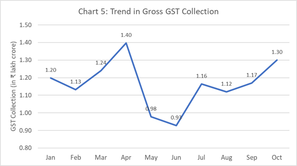 ಅಕ್ಟೋಬರ್ 2021ರ ತಿಂಗಳಲ್ಲಿ ಸಂಗ್ರಹಿಸಲಾದ ಒಟ್ಟು ಜಿಎಸ್ ಟಿ ಆದಾಯವು 1,30,127 ಕೋಟಿ ರೂಗಳಾಗಿದ್ದು, ಇದರಲ್ಲಿ ಕೇಂದ್ರ ಸರ್ಕಾರದ ಪಾಲಿನ (CGST) 23,861 ಕೋಟಿ ರೂ., ರಾಜ್ಯ ಸರ್ಕಾರಗಳ ಪಾಲಿನ (SGST) 30,421 ಕೋಟಿ ರೂ., ಐಜಿಎಸ್ ಟಿ (IGST) 67,361 ಕೋಟಿ ರೂ. (ಸರಕುಗಳ ಆಮದಿನಲ್ಲಿ ಸಂಗ್ರಹಿಸಲಾದ 32,998 ಕೋಟಿ ರೂ. ಸೇರಿದಂತೆ), ಉಪಕರ (CESS) 8,484 ಕೋಟಿ ರೂ. (ಸರಕುಗಳ ಆಮದಿನಲ್ಲಿ ಸಂಗ್ರಹಿಸಲಾದ 699 ಕೋಟಿ ರೂ. ಸೇರಿದಂತೆ) ಆಗಿದೆ.