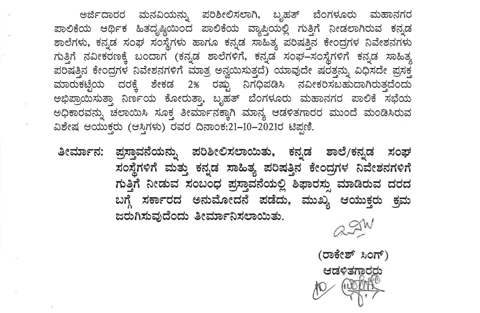 ಬಳಿಕ ಆಡಳಿತಗಾರರ ನೇತೃತ್ವದ ಕೌನ್ಸಿಲ್ ಸಭೆಯು 2021ರ ಇಸವಿಯ ಅ.29ರಂದು  ( ವಿಷಯ ಸಂಖ್ಯೆ : 344/2021-22) ಕರೋನಾ ಸಾಂಕ್ರಾಮಿಕ ರೋಗದಿಂದ ಜರ್ಜರಿತವಾಗಿದ್ದ ಪಾಲಿಕೆಗೆ ಆರ್ಥಿಕ ಸಂಪನ್ಮೂಲ ಕ್ರೋಢೀಕರಣದ ದೃಷ್ಟಿಯಿಂದ, ಪಾಲಿಕೆಯ ಗುತ್ತಿಗೆ ಅವಧಿ ಮುಗಿದ ನಿವೇಶನಗಳ ನವೀಕರಣ ಸಂದರ್ಭದಲ್ಲಿ ಯಾವುದೇ ಷರತ್ತು ವಿಧಿಸದೆ “ಪ್ರಸಕ್ತ ಮಾರುಕಟ್ಟೆ ಬೆಲೆಯ ಶೇ. 2ರಷ್ಟು ಗುತ್ತಿಗೆ ಶುಲ್ಕ” (Present Market Rate 2%) ನಿಗದಿಪಡಿಸುವಂತೆ ನಿರ್ಣಯ ಕೈಗೊಂಡು ಸರ್ಕಾರಕ್ಕೆ ಕಳುಹಿಸಿಕೊಟ್ಟಿದ್ದರು. ಇವರೆಡೂ ಕೌನ್ಸಿಲ್ ನಿರ್ಣಯಗಳು, ಯಾವುದೇ ಲಾಭದ ಆಕಾಂಕ್ಷೆಯಿಲ್ಲದೆ ನಡೆಯುತ್ತಿರುವ ಕನ್ನಡ ಶಾಲೆಗಳು ಹಾಗೂ ಕನ್ನಡ ಸಂಘಸಂಸ್ಥೆಗಳಿಗೆ ಇವು ಮಾರಕವಾದ ನಿರ್ಣಯಗಳಾಗಿದ್ದವು.