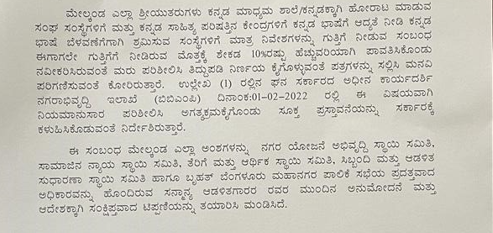 ಹೀಗಾಗಿ ಈ ನಿರ್ಣಯಕ್ಕೆ ತಿದ್ದುಪಡಿ ನಿರ್ಣಯ ಕೈಗೊಳ್ಳಲು ನಿರ್ದೇಶಿಸಬೇಕು ಎಂದು ಮಾಜಿ ಮೇಯರ್ ಗಳಾದ ಕಟ್ಟೆ ಸತ್ಯ ನಾರಾಯಣ, ಎಸ್.ಕೆ.ನಟರಾಜ್, ಮಾಜಿ ಉಪ ಮೇಯರ್ ಎಸ್.ಹರೀಶ್, ನಗರದ ಶಾಸಕರು, ಸಚಿವರು ಸೇರಿದಂತೆ 16 ಮಂದಿ ಜನಪ್ರತಿನಿಧಿಗಳು ಮುಖ್ಯಮಂತ್ರಿ ಬಸವರಾಜ ಬೊಮ್ಮಾಯಿ ಅವರಿಗೆ ಮನವಿ ಪತ್ರ ನೀಡಿದ್ದರು. ಆ ಪತ್ರದಲ್ಲಿ ಕನ್ನಡ ಭಾಷೆಯ ಬೆಳವಣಿಗೆಗಾಗಿ ಶ್ರಮಿಸುವ ಸಂಸ್ಥೆಗಳಿಗೆ ಈಗಾಗಲೇ ಗುತ್ತಿಗೆ ನೀಡಿರುವ ಮೊತ್ತಕ್ಕೆ ಶೇ.10ರಷ್ಟು ಹೆಚ್ಚುವರಿಯಾಗಿ ಪಾವತಿಸಿಕೊಂಡು ಗುತ್ತಿಗೆ ಅವಧಿ ನವೀಕರಿಸುವಂತೆ ಕೋರಿದ್ದರು. ಈ ಪತ್ರ ಆಧರಿಸಿ ಮುಖ್ಯಮಂತ್ರಿಗಳ ಪ್ರಧಾನ ಕಾರ್ಯದರ್ಶಿ ಮಂಜುನಾಥ್ ಪ್ರಸಾದ್, ಈ ಹಿಂದೆ ಕೈಗೊಂಡ ಕೌನ್ಸಿಲ್ ನಿರ್ಣಯದ ಬಗ್ಗೆ ತಿದ್ದುಪಡಿ ನಿರ್ಣಯದ ಬಗ್ಗೆ ಸರ್ಕಾರಕ್ಕೆ ಸೂಕ್ತ ಪ್ರಸ್ತಾವನೆ ಸಲ್ಲಿಸಲು ನಗರಾಭಿವೃದ್ಧಿ ಇಲಾಖೆಗೆ 10-01-2022ರಂದು ಟಿಪ್ಪಣಿ ಪತ್ರ ಬರೆದು ಸೂಚಿಸಿದ್ದರು. ಈ ಹಿನ್ನಲೆಯಲ್ಲಿ ಬಿಬಿಎಂಪಿ ಆಸ್ತಿವಿಭಾಗದಿಂದ ಕಡತ ಸಿದ್ಧವಾಗಿ, ಬಿಬಿಎಂಪಿ ಆಯುಕ್ತರ ಮೂಲಕ ಪಾಲಿಕೆ ಆಡಳಿತಗಾರರಾದ ರಾಕೇಶ್ ಸಿಂಗ್ ಕಚೇರಿಗೆ ಬರಬೇಕಿದೆ.