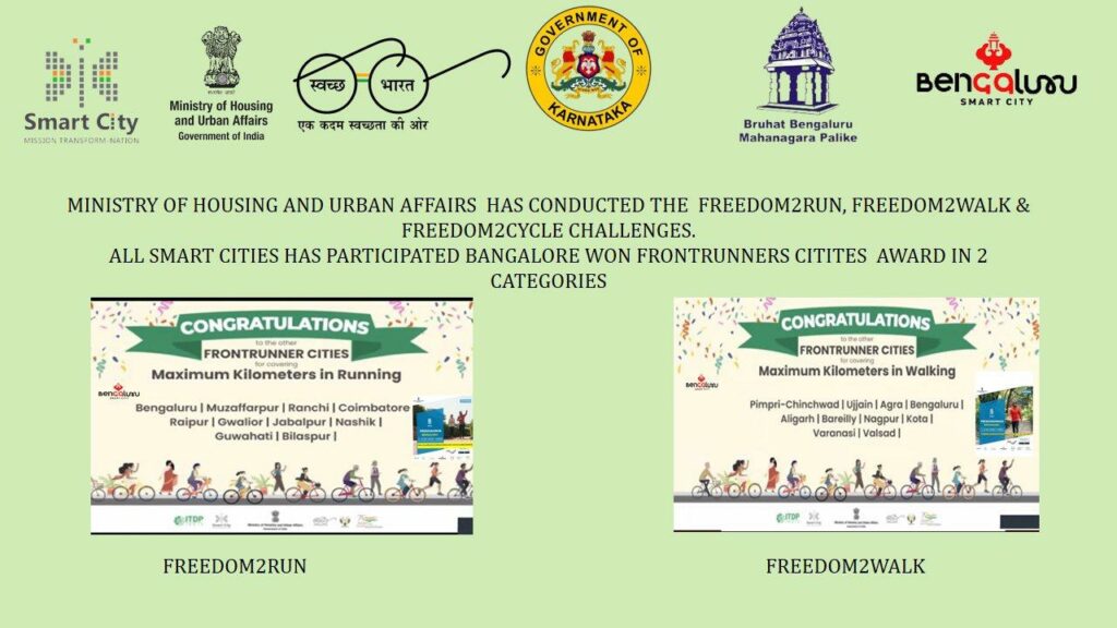 ಇವುಗಳ ಪೈಕಿ, ನಡಿಗೆ ಮತ್ತು ಓಟದ ಸ್ಪರ್ಧೆಗಳಲ್ಲಿ ಬೆಂಗಳೂರು ಸ್ಮಾರ್ಟ್ ಸಿಟಿ ಮುಂಚೂಣಿ ನಗರ (Front Runner City ) ಎಂಬ ವಿಶೇಷ ಪ್ರಶಸ್ತಿಗೆ ಭಾಜನವಾಗಿದೆ.