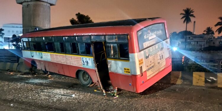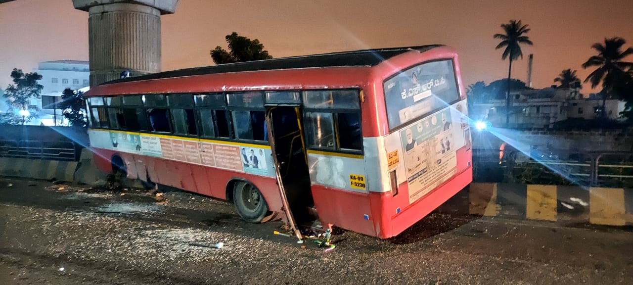 ಮಡಿಕೇರಿಯಿಂದ ಬೆಂಗಳೂರಿಗೆ ಬರುತ್ತಿದ್ದ ಕೆಎಸ್ಆರ್ ಟಿ ಸಿ ಬಸ್ ಕೆಂಗೇರಿಯ ಭಾರತ್ ಪೆಟ್ರೋಲ್ ಬಂಕ್ ಸಮೀಪ ಚಾಲಕನ ನಿಯಂತ್ರಣ ತಪ್ಪಿ ಮೆಟ್ರೋ ಪಿಲ್ಲರ್ ಗೆ ಬಸ್ ಡಿಕ್ಕಿ ಆಗಿದೆ. ರಾತ್ರಿ 1.30 ರ ಸುಮಾರಿಗೆ ಕೆಂಗೇರಿ ಠಾಣೆ ವ್ಯಾಪ್ತಿಯಲ್ಲಿ ಘಟನೆ ನಡೆದಿದೆ. ನಾಲ್ಕು ಅಡಿವರೆಗೆ ರಸ್ತೆಪಕ್ಕದ ತಡೆಗೋಡೆಗೆ ಗುದ್ದಿ ನಂತರ ಮೆಟ್ರೋ ಪಿಲ್ಲರ್ ಗೆ ಡಿಕ್ಕಿ ಹೊಡೆದಿದೆ.