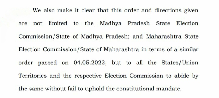 ಸುಪ್ರೀಂಕೋರ್ಟ್ ನ್ಯಾಯಮೂರ್ತಿ ಜೆ.ಕಾನ್ವಿಲ್ಕರ್ ನೇತೃತ್ವದ ತ್ರಿಸದಸ್ಯ ಪೀಠ ಸುರೇಶ್ ಮಹಾಜನ್ ಹಾಗೂ ಮಧ್ಯಪ್ರದೇಶ ಸರ್ಕಾರದ ನಡುವಿನ ಮೇಲ್ಮನವಿ ಪ್ರಕರಣದಲ್ಲಿ ಈ ಪ್ರಮುಖ ಆದೇಶ ಹೊರಡಿಸಿ, ಆಯಾ ರಾಜ್ಯಗಳು ಮತ್ತು ಕೇಂದ್ರಾಡಳಿತ ಪ್ರದೇಶಗಳ ಚುನಾವಣಾ ಆಯೋಗ ಸ್ಥಳೀಯಾಡಳಿತ ಚುನಾವಣೆ ನಡೆಸುವ ಸಂಬಂಧ 15 ದಿನದ ಒಳಗಾಗಿ ಚುನಾವಣೆ ನಡೆಸುವಂತೆ ತೀರ್ಪು ನೀಡಿದೆ.