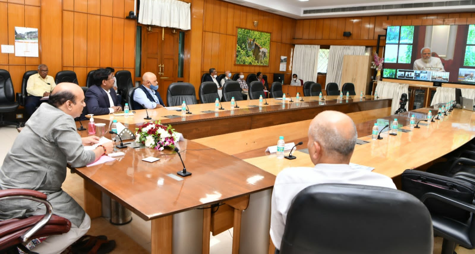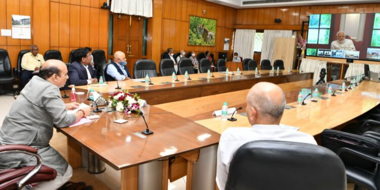 ಬೆಂಗಳೂರಿನ ಗೃಹ ಕಚೇರಿ ಕೃಷ್ಣಾದಿಂದ ಸಿಎಂ ಬಸವರಾಜ ಬೊಮ್ಮಾಯಿ ವಿಡಿಯೋ ಕಾನ್ಫರೆನ್ಸ್ ನಲ್ಲಿ ಕಾರ್ಯಕ್ರಮದ ಪೂರ್ವ ಸಿದ್ಧತೆಗಳ ಬಗ್ಗೆ ಪ್ರಧಾನಿಗಳ ಜತೆ ಸೋಮವಾರ ಮಾತುಕತೆ ನಡೆಸಿದರು.
