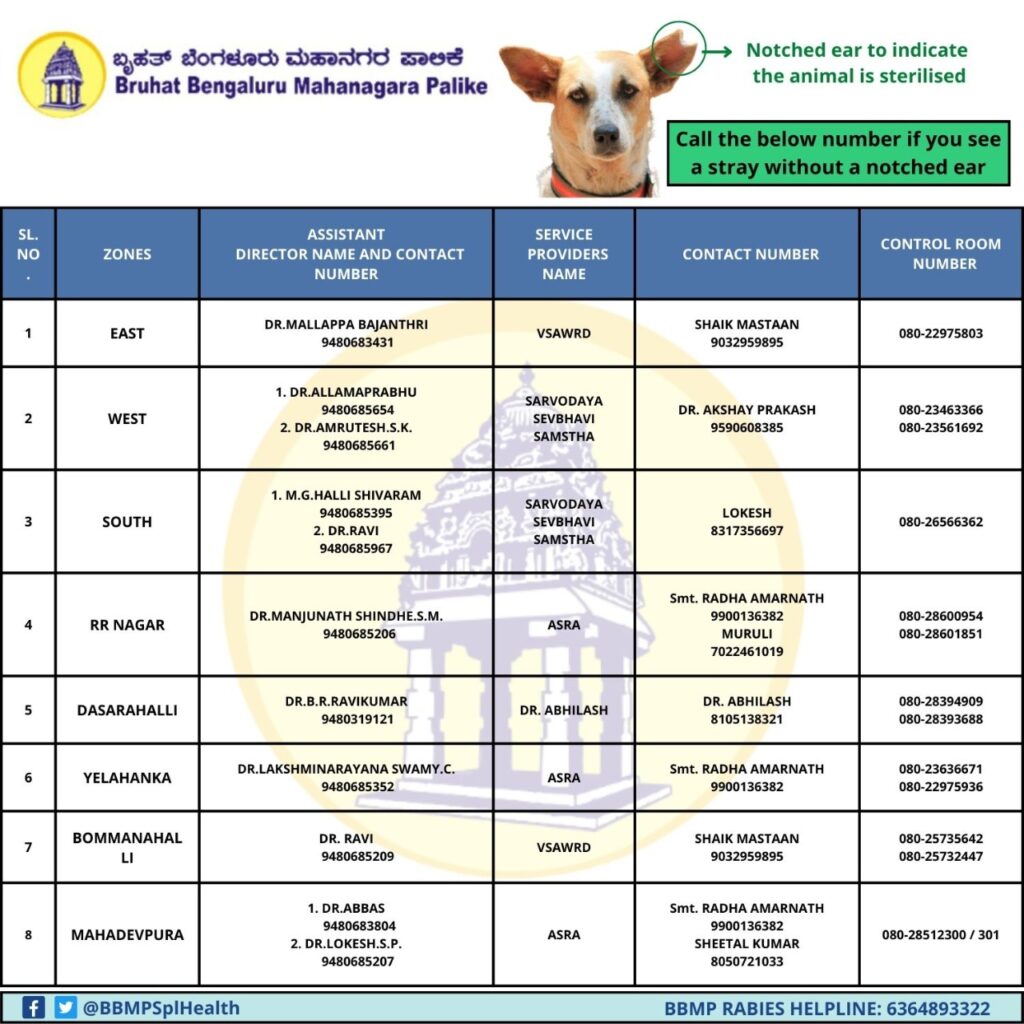 ಬೀದಿ ನಾಯಿ ಕಡಿತ ಮತ್ತಿತರ ಸಂಬಂಧಿತ ದೂರುಗಳಿಗೆ ವಲಯ ಕಚೇರಿಗಳ ದೂರವಾಣಿ ಮತ್ತು ಸಹಾಯವಾಣಿ ಮಾಹಿತಿ
