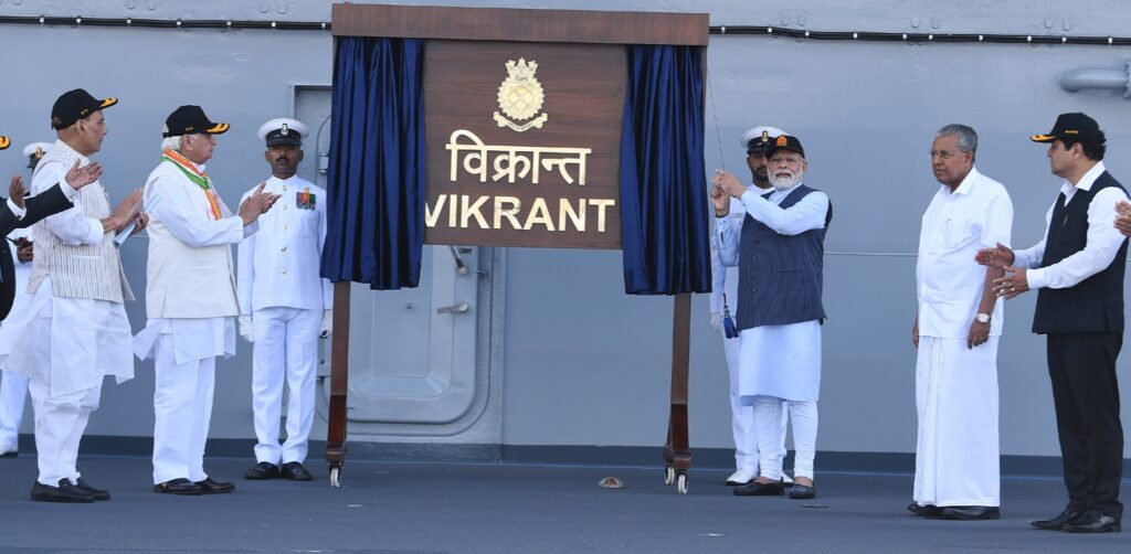ಪ್ರಧಾನಮಂತ್ರಿ ನರೇಂದ್ರ ಮೋದಿ ಅವರು ಇಂದು ದೇಶದ ಮೊದಲ ಸ್ವದೇಶಿ ವಿಮಾನವಾಹಕ ನೌಕೆ INS ವಿಕ್ರಾಂತ್ ಅನ್ನು ರಾಷ್ಟ್ರಕ್ಕೆ ಸಮರ್ಪಿಸಿದರು. ಈ ಸಂದರ್ಭದಲ್ಲಿ, ವಸಾಹತುಶಾಹಿ ಭೂತಕಾಲವನ್ನು ತೊಡೆದುಹಾಕುವ ಮತ್ತು ಶ್ರೀಮಂತ ಭಾರತೀಯ ಕಡಲ ಪರಂಪರೆಗೆ ಸರಿಹೊಂದುವ ಹೊಸ ನೌಕಾ ಧ್ವಜವನ್ನು (ನಿಶಾನ್) ಪ್ರಧಾನ ಮಂತ್ರಿ ಇದೇ ಸಂದರ್ಭದಲ್ಲಿ ಅನಾವರಣಗೊಳಿಸಿದರು.