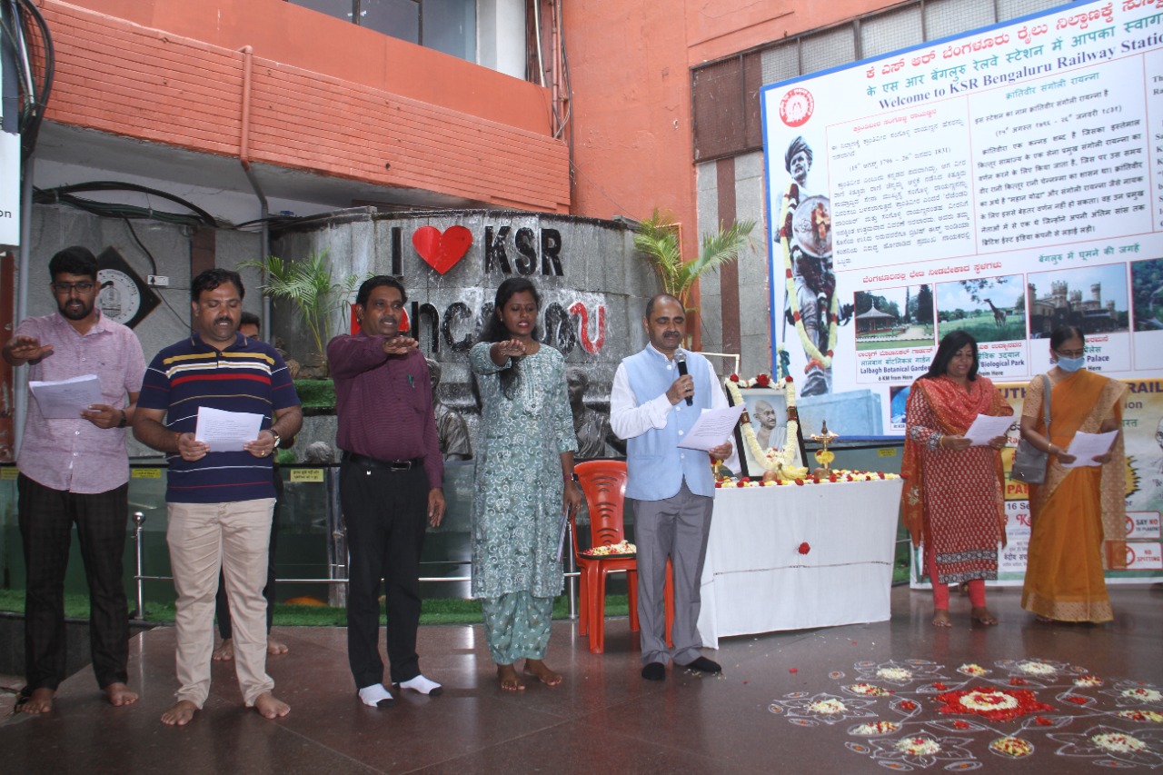 ಇದಕ್ಕೂ ಮುನ್ನ ನಡೆದ ಗಾಂಧಿ ಜಯಂತಿ ಕಾರ್ಯಕ್ರಮದಲ್ಲಿ ನೈಋತ್ಯ ರೈಲ್ವೆ ಬೆಂಗಳೂರು ವಿಭಾಗದ ವಿಭಾಗೀಯ ರೈಲ್ವೆ ವ್ಯವಸ್ಥಾಪಕ ಶ್ಯಾಮ್ ಸಿಂಗ್ ಮಹಾತ್ಮ ಗಾಂಧೀಜಿಯವರ ಭಾವಚಿತ್ರಕ್ಕೆ ಪುಷ್ಪ ನಮನ ಸಲ್ಲಿಸಿದರು. ಇದೇ ವೇಳೆ ಸ್ವಚ್ಛತೆಯ ಕುರಿತಂತೆ ಪ್ರತಿಜ್ಞಾವಿಧಿ ಬೋಧಿಸಿದರು. ಇದರಲ್ಲಿ ರೈಲ್ವೆ ಅಧಿಕಾರಿಗಳು, ಸಿಬ್ಬಂದಿ ಹಾಗೂ ಸಾರ್ವಜನಿಕರು ಭಾಗವಹಿಸಿದ್ದರು.