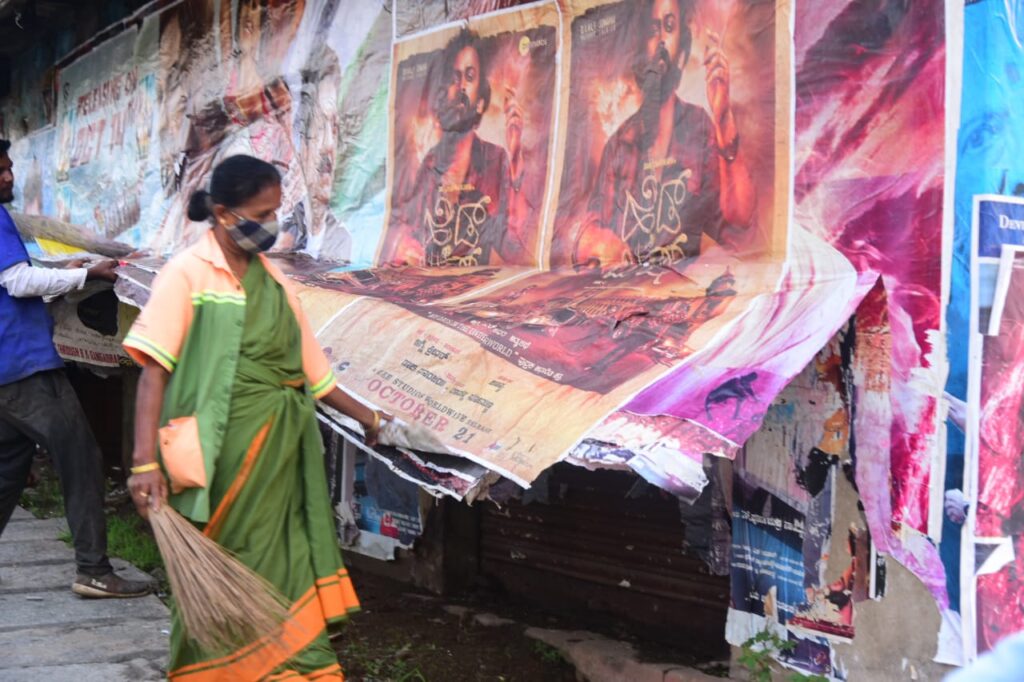 ಅನಧಿಕೃತವಾಗಿ ಹಾಕಿರುವ ಪೋಸ್ಟರ್ ತೆಗೆಯುತ್ತಿರುವ ಪೌರಕಾರ್ಮಿಕರು