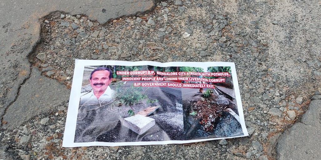 ನಗರದಲ್ಲಿ ಆಯಾ ಕ್ಷೇತ್ರದ ಶಾಸಕರು, ಸಂಸದರು ಪ್ರತಿನಿಧಿಸುವ ಕ್ಷೇತ್ರದಲ್ಲಿ ಗುಂಡಿ ಬಿದ್ದಿರುವ ರಸ್ತೆಗಳಲ್ಲಿ ಆಯಾ ಶಾಸಕರು, ಸಂಸದರು, ಸಚಿವರ ಭಾವಚಿತ್ರಗಳನ್ನು ಇಟ್ಟು ಸರ್ಕಾರದ ನಡೆಯನ್ನು ಖಂಡಿಸಿ ವಿನೂತನ ಪ್ರತಿಭಟನೆಯನ್ನು ನಡೆಸಲಾಯಿತು. ಅಧಿಕಾರದಲ್ಲಿರುವ ಬಿಜೆಪಿ ಜನಪ್ರತಿನಿಧಿಗಳ ನಿರ್ಲಕ್ಷ್ಯತನವನ್ನು ಜನರಿಗೆ ತೋರಿಸುವ ಉದ್ದೇಶದಿಂದ ಅವರ ಭಾವಚಿತ್ರವನ್ನು ಗುಂಡಿಬಿದ್ದ ರಸ್ತೆಗಳಲ್ಲಿಟ್ಟು ಸರ್ಕಾರದ ನಡೆಯನ್ನು ಕಾಂಗ್ರೆಸ್ ಪಕ್ಷದ ಕಾರ್ಯಕರ್ತರು ಖಂಡಿಸಿದರು.
