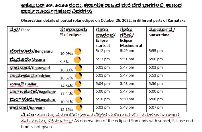 ಕರ್ನಾಟಕದ ರಾಜಧಾನಿ ಬೆಂಗಳೂರು, ಮೈಸೂರು, ಧಾರವಾಡ, ರಾಯಚೂರು, ಬಳ್ಳಾರಿ, ಬಾಗಲಕೋಟೆ, ಮಂಗಳೂರು ಹಾಗೂ ಕಾರವಾರ ಸ್ಥಳಗಳಲ್ಲಿ ಸೂರ್ಯಗ್ರಹಣ ಪ್ರಾರಂಭ, ಅದರ ಉತ್ತುಂಗದ ಕ್ಷಣ ಹಾಗೂ ಸೂರ್ಯಸ್ತದ ಸಮಯ ಈ ಕೆಳಕಂಡಂತಿದೆ.