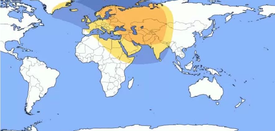 ಯುರೋಪ್, ಮಧ್ಯಪ್ರಾಚ್ಯ, ಆಫ್ರಿಕಾದ ಈಶಾನ್ಯ ಭಾಗಗಳು, ಪಶ್ಚಿಮ ಏಷ್ಯಾ, ಉತ್ತರ ಅಟ್ಲಾಂಟಿಕ್ ಸಾಗರ ಮತ್ತು ಉತ್ತರ ಹಿಂದೂ ಮಹಾಸಾಗರ ಪ್ರದೇಶದಲ್ಲಿ ಗ್ರಹಣ ಸ್ಪಷ್ಟವಾಗಿ ಗೋಚರಿಸುತ್ತದೆ.