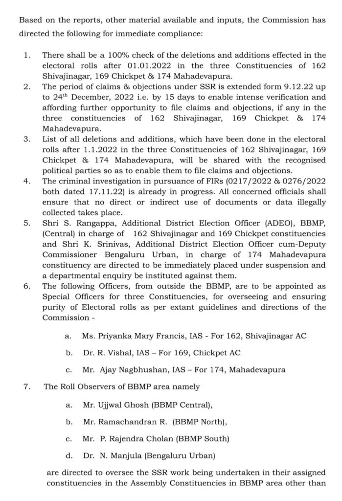 ಇದಲ್ಲದೆ ಈ ಮೂರು ವಿಧಾನಸಭಾ ಕ್ಷೇತ್ರದಲ್ಲಿ ಮತದಾರರ ಪಟ್ಟಿಯ ಸಮಗ್ರ ಪರಿಶೀಲನೆಗೆ ನಿರ್ದೇಶನ ನೀಡಿದೆ. ಬಿಬಿಎಂಪಿ ವಿಶೇಷ ಆಯುಕ್ತ ಎಸ್.ರಂಗಪ್ಪ ಹಾಗೂ ಬೆಂಗಳೂರು ನಗರ ಜಿಲ್ಲಾಧಿಕಾರಿ ಕೆ.ಶ್ರೀನಿವಾಸ್ ಅವರನ್ನು ತಕ್ಷಣದಿಂದಲೇ ಜಾರಿಗೆ ಬರುವಂತೆ ಅಮಾನತಿಗೆ ನಿರ್ದೇಶನ ನೀಡಿದೆ. ಬಿಬಿಎಂಪಿಯ ವಿಶೇಷ ಆಯುಕ್ತ ರಂಗಪ್ಪ ಅವರು, ಶಿವಾಜಿನಗರ ಮತ್ತು ಚಿಕ್ಕಪೇಟೆ ಕ್ಷೇತ್ರಗಳ ಹೆಚ್ಚುವರಿ ಜಿಲ್ಲಾ ಚುನಾವಣಾಧಿಕಾರಿಯಾಗಿದ್ದರು. ಹಾಗೂ ಶ್ರೀನಿವಾಸ್ ಮಹದೇವಪುರ ಕ್ಷೇತ್ರದ ಹೆಚ್ಚುವರಿ ಜಿಲ್ಲಾ ಚುನಾವಣಾಧಿಕಾರಿಯಾಗಿದ್ದರು. ಈ ಇಬ್ಬರು ಐಎಎಸ್ ಅಧಿಕಾರಿಗಳನ್ನು ಅಮಾನತುಗೊಳಿಸಿ, ಇಲಾಖೆ ವಿಚಾರಣೆ ವಿಚಾರಣೆ ಆರಂಭಿಸುವಂತೆ ಕೇಂದ್ರ ಚುನಾವಣಾ ಆಯೋಗ ರಾಜ್ಯ ಸರ್ಕಾರದ ಮುಖ್ಯ ಕಾರ್ಯದರ್ಶಿಗೆ ನಿರ್ದೇಶನ ನೀಡಿದೆ.