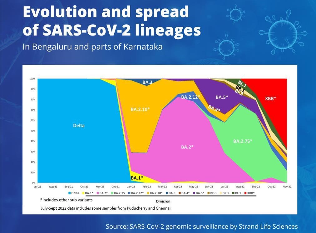ಇದೇ ವೇಳೆ ಓಮಿಕ್ರಾನ್ ನ ಬಿಎ.2.75 (BA.2.75) ಶೇ.15ರಷ್ಟು, ಬಿ.ಎ.2 (BA.2) ಶೇ.3ರಷ್ಟು, ಬಿ.ಎ.3 (BA.3) ಶೇ.2ರಷ್ಟು ಇಳಿಕೆಯಾಗುತ್ತಿರುವುದನ್ನು ಗಮನಿಸಿದೆ. ಕೇಂದ್ರ ಮತ್ತು ರಾಜ್ಯ ಸರ್ಕಾರದ ಪ್ರಾಮಾಣಿಕೃತವಾದ ಪ್ರಯೋಗಾಲಯವಾದ ಸ್ಟ್ರಾಂಡ್ ಲೈಫ್ ಸೈನ್ಸ್ ಬಿಕ್ಯೂ.1 (BQ.1) ಹಾಗೂ ಸಿಎಚ್.1.1 (CH.1.1) ರೂಪಾಂತರ ತಳಿಯು ಬೆಂಗಳೂರಿನಲ್ಲಿ ಕಂಡು ಬಂದಿರುವುದನ್ನು ದೃಢಪಡಿಸಿದೆ. ಆದರೆ ಚೀನಾದಲ್ಲಿ ಕರೋನಾ ಸೋಂಕು ಉಲ್ಭಣಗೊಳ್ಳಲು ಕಾರಣವಾದ ಓಮಿಕ್ರಾನ್ ನ ಉಪತಳಿಯಾದ ಬಿಎಫ್.7 ನವೆಂಬರ್ ತಿಂಗಳಿನಲ್ಲಿ ನಮ್ಮಲ್ಲಿ ಕಂಡು ಬಂದಿಲ್ಲ ಎಂದು ತಿಳಿಸಿದೆ.