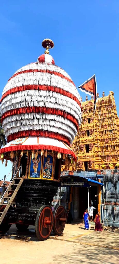 ಸಾಲಿಗ್ರಾಮದ ರಥೋತ್ಸವಕ್ಕೆ ಸಿದ್ಧವಾಗಿರುವ ರಥ ದೇವಸ್ಥಾನದ ಮುಂದೆ ನಿಂತಿರುವ ಚಿತ್ರ