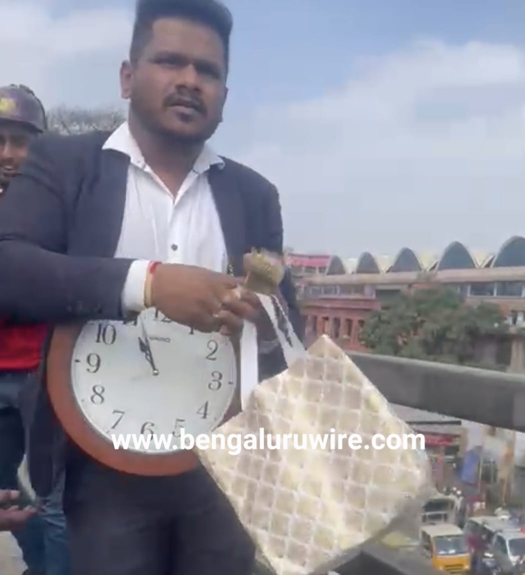 ಕತ್ತಿಗೆ ಗಡಿಯಾರ ಸಿಕ್ಕಿಸಿಕೊಂಡು, ಬ್ಯಾಗಿನಿಂದ ನೋಟುಗಳನ್ನು ಮೈಸೂರು ರಸ್ತೆ ಫ್ಲೈಓವರ್ ಮೇಲಿಂದ ಜನರತ್ತ ಎಸೆಯುತ್ತಿರುವ ಅರುಣ್ ಎನ್ನಲಾದ ವ್ಯಕ್ತಿ