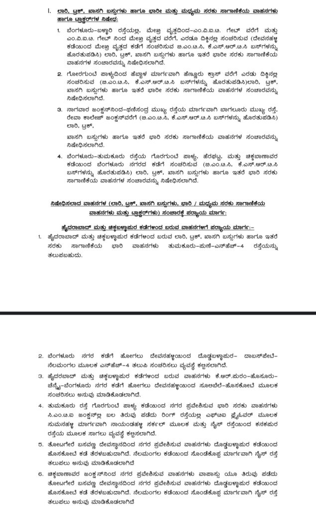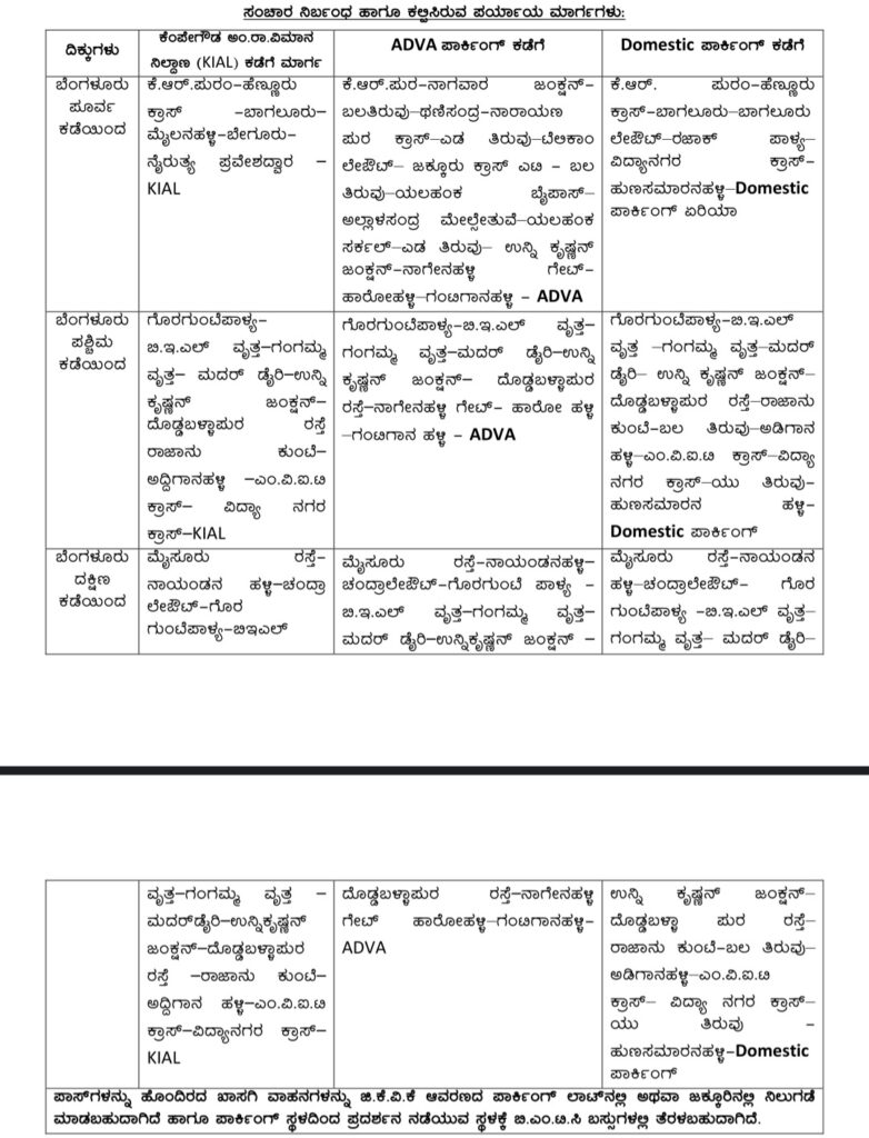 ಸಂಚಾರ ನಿರ್ಬಂಧಿಸಿದ ಕಡೆಗಳಲ್ಲಿ ಪರ್ಯಾಯ ಮಾರ್ಗಗಳ ಸಂಚಾರ ವ್ಯವಸ್ಥೆಯನ್ನು ಮಾಡಿದ್ದಾರೆ. ಈ ಕೆಳಕಂಡ ರಸ್ತೆಗಳಲ್ಲಿ ಭಾರೀ ವಾಹನಗಳ ನಿಷೇಧ ಹಾಗೂ ವಾಹನ ನಿಲುಗಡೆ ನಿರ್ಬಂಧ ಮಾಡಿದ್ದಾರೆ. ಕೆಲವು ಕಡೆ ಏಕಮುಖ ಸಂಚಾರ ವ್ಯವಸ್ಥೆಯನ್ನು ತಾತ್ಕಾಲಿಕವಾಗಿ ಜಾರಿಗೆ ತರಲಿದ್ದಾರೆ.