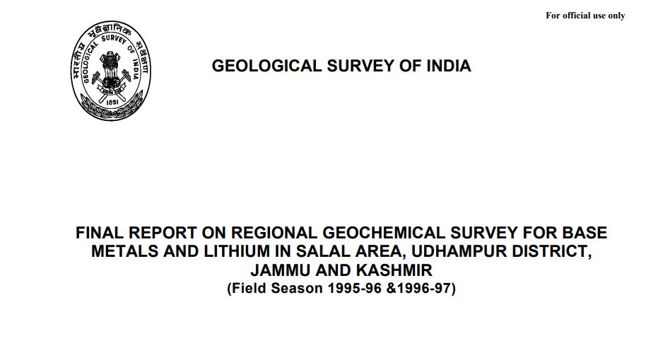 ಬ್ರೆಜಿಲ್, ಕೊಲಂಬಿಯಾ, ರಷ್ಯಾ ಹಾಗೂ ಚೈನಾ ರಾಷ್ಟ್ರಗಳಲ್ಲಿ ಮಾತ್ರ ಲೀಥಿಯಂ ಖನಿಜ ನಿಕ್ಷೇಪವಿದೆ. ಆದರೆ ಈ ಪಟ್ಟಿಗಳ ಸಾಲಿಗೆ ಈಗ ಭಾರತವೂ ಸೇರ್ಪಡೆಯಾದಂತಾಗಿದೆ. 1995-96 ಹಾಗೂ 1996-97ರ ತನಿಖೆಯ ಸಂದರ್ಭದಲ್ಲಿ, 350 ಚ.ಕಿ. ಕಿಮೀ ಭೂರಾಸಾಯನಿಕವಾಗಿ ಸಮೀಕ್ಷೆ ನಡೆಸಲಾಗಿತ್ತು. 1:50,000 ಮಾಪಕದಲ್ಲಿ ಕತ್ರಾ- ಮುತ್ತಲ್- ಪ್ರೆಸ್- ಸೆರ್ಸಂದು- ಸಲಾಲ್- ಪನಾಸ- ಪಯೋನಿ- ರಂಸುಹ್- ಚಕರ್ ಪ್ರದೇಶದಲ್ಲಿ ಬೇಸ್ ಮೆಟಲ್ ಮತ್ತು ಲಿಥಿಯಂ ನಿಕ್ಷೇಪ ಪತ್ತೆಗಾಗಿ ಈ ಪ್ರದೇಶಗಳಲ್ಲಿ 804 ಮಾದರಿಗಳ ಸಂಗ್ರಹದೊಂದಿಗೆ 17 Cu.m ಗುಂಡಿ ಅಥವಾ ಕಂದಕವನ್ನು ನೋಡಿ ಜಿಎಎಸ್ಐ ಅಧ್ಯಯನ ಕೈಗೊಂಡಿತ್ತು. ಭೂವಿಜ್ಞಾನಿಗಳಾದ ಕೆ.ಕೆ.ಶರ್ಮ ಹಾಗೂ ಎಸ್.ಸಿ.ಉಪ್ಪಲ್ ನವರು ಈ ಕುರಿತಂತೆ ಸರ್ಕಾರಕ್ಕೆ 1997ರಲ್ಲಿ ಅಂತಿಮ ವರದಿಯನ್ನು ಸಲ್ಲಿಕೆ ಮಾಡಿದ್ದರು.