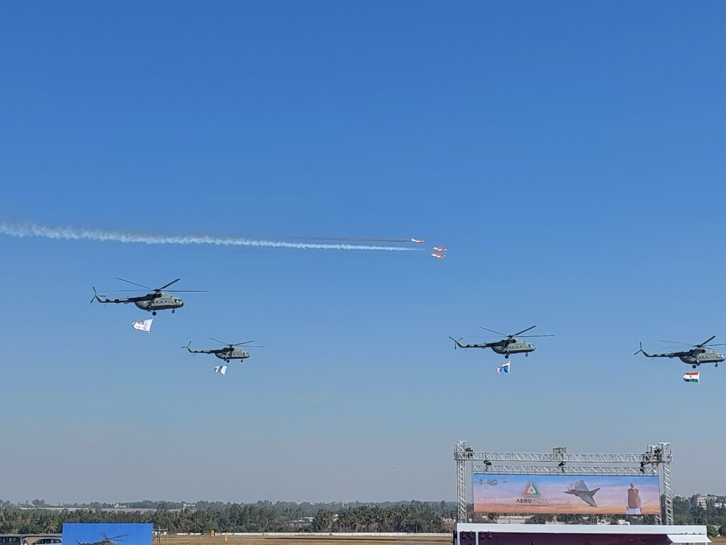 ಮೊದಲಿಗೆ ಫ್ಲೈಪಾಸ್ಟ್ ರಚನೆಯ ಮಾದರಿಯಲ್ಲಿ ಭಾರತದ ಬಾವುಟ ಮುಂಭಾಗದಲ್ಲಿ ಹಾಗೂ ಹಿಂಭಾಗದಲ್ಲಿ ವಾಯುಪಡೆ ಹಾಗೂ ಏರ್ ಶೋ ಬಾವುಟವನ್ನು ಹೊತ್ತ ಮೂರು ಎಂಐ17 ಹೆಲಿಕಾಪ್ಟರ್ ಗಳು ಆಕಾಶದಲ್ಲಿ ಹಾರುತ್ತ ಏರ್ ಶೋ ಪ್ರಧಾನ ವೇದಿಕೆ ಮುಂಭಾಗ ಹಾರಿಬಂದರೆ ಹಿನ್ನಲೆಯಲ್ಲಿ ಮೂರು ಸೂರ್ಯಕಿರಣ್ ವಿಮಾನಗಳು ತ್ರಿವರ್ಣ ಧ್ವಜದ ಬಣ್ಣದ ಹೊಗೆಯನ್ನು ಸೂಸಿ, ನೀಲಾಕಾಶದಲ್ಲಿ ಭಾರತದ ಬಾವುಟದ ಚಿತ್ತಾರವನ್ನು ಮೂಡಿಸಿದವು.
