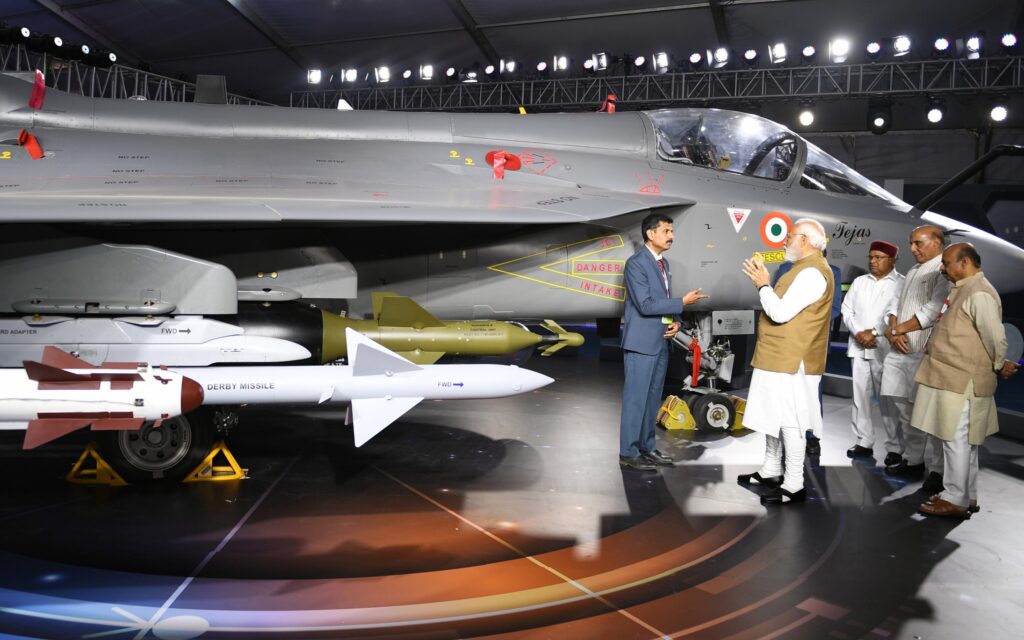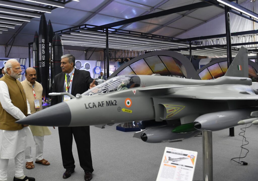 ಏರೊ ಇಂಡಿಯಾ ಮಳಿಗೆಯಲ್ಲಿ ಎಲ್ ಸಿಎ ತೇಜಸ್ ಮಾರ್ಕ್-2 ಯುದ್ಧ ವಿಮಾನ ಮಾದರಿಯ ಬಗ್ಗೆ ಪ್ರದರ್ಶಕರಿಂದ ಕೇಳಿ ತಿಳಿದುಕೊಂಡ ಪ್ರಧಾನಿ‌ ಮೋದಿ.