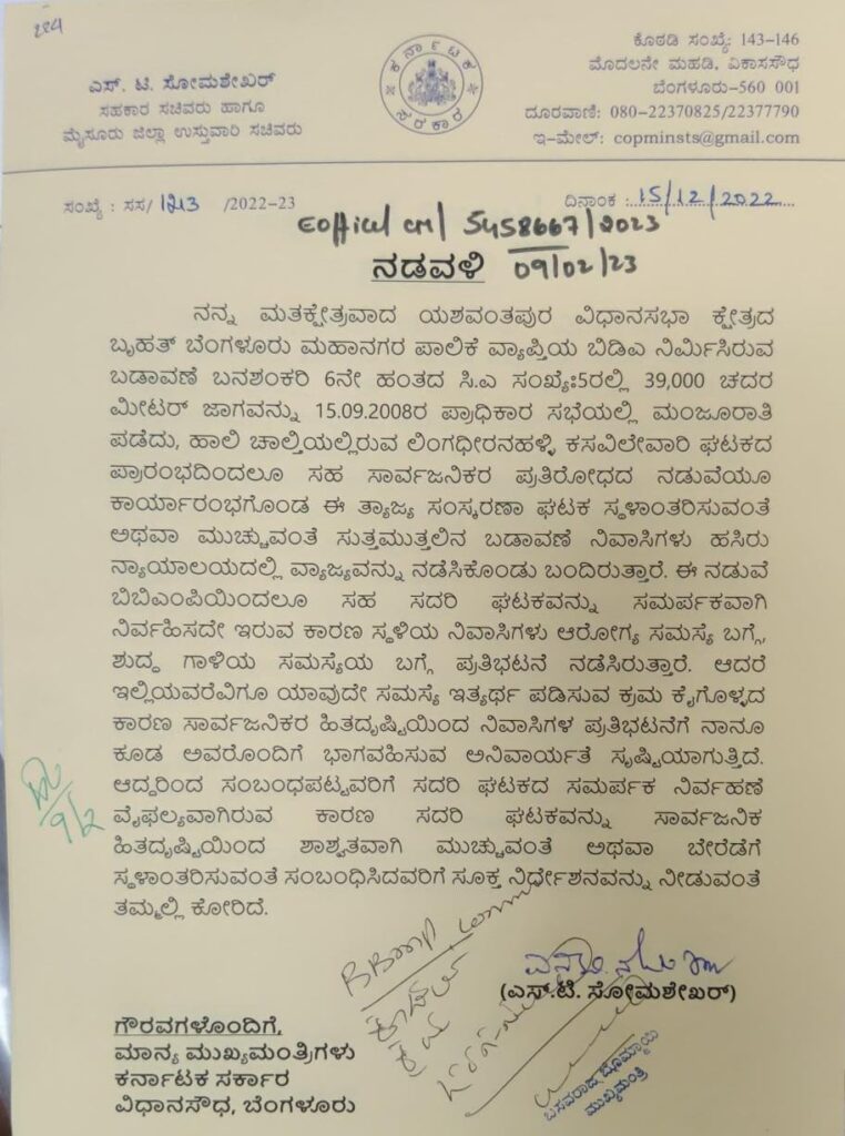ಸಹಕಾರ ಸಚಿವ ಮತ್ತು ಶಾಸಕರಾದ ಎಸ್.ಟಿ.ಸೋಮಶೇಖರ್ ಸಿಎಂ ಬೊಮ್ಮಾಯಿ ಅವರಿಗೆ ಬರೆದ ಪತ್ರ