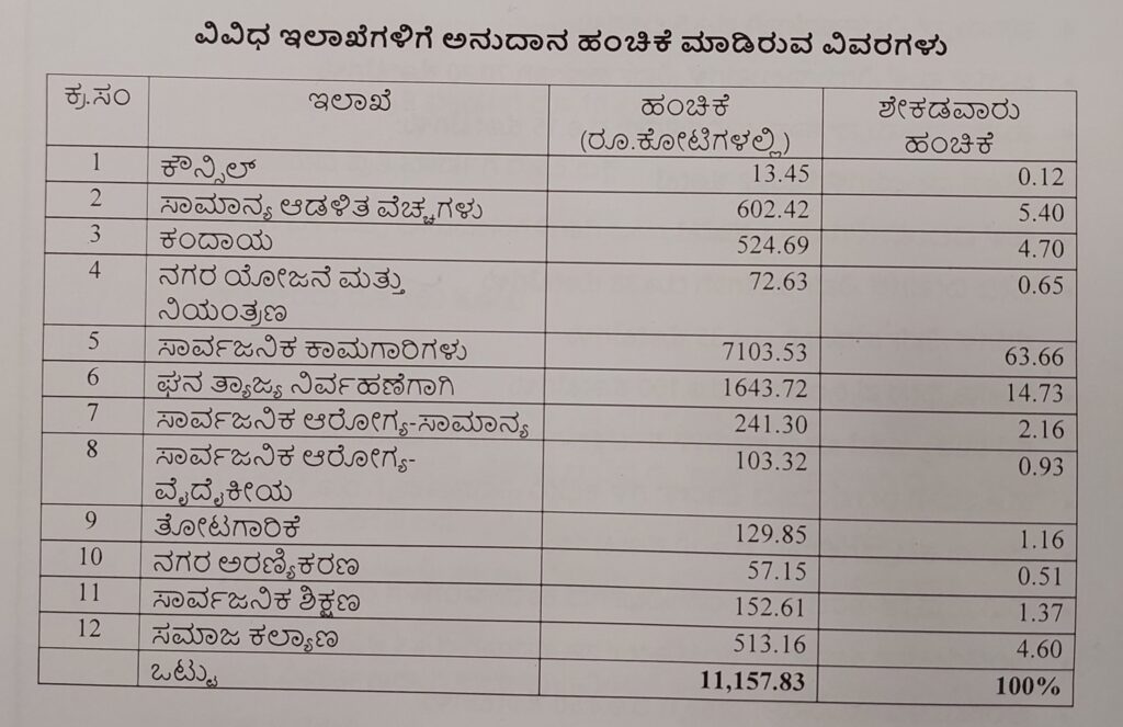 ನಗರದ ಟೌನ್ ಹಾಲ್ ನಲ್ಲಿ ಹಣಕಾಸು ವಿಭಾಗದ ವಿಶೇಷ ಆಯುಕ್ತ ಜಯರಾಮ್ ರಾಯ್ ಪುರೆ ಗುರುವಾರ ಬೆಳಗ್ಗೆ ಆಯವ್ಯಯ ಮಂಡಿಸಿದರು. 20023-24ನೇ ಆಯವ್ಯಯದಲ್ಲಿ 7,070.11 ಕೋಟಿ ರೂ. ಪಾಲಿಕೆ ಆದಾಯ, ಕೇಂದ್ರ- ರಾಜ್ಯದ ಅನುದಾನಗಳು 4,093.86 ಕೋಟಿ ರೂ ಇರಲಿದ್ದು, ಒಟ್ಟು ಸ್ವೀಕೃತಿ 11,163.97 ಕೋಟಿ ರೂ.ಗಳಿದ್ದರೆ, 11,157.83 ಕೋಟಿ ರೂ. ಒಟ್ಟು ಖರ್ಚು ಸೇರಿದಂತೆ 6.14 ಕೋಟಿ ರೂ. ಉಳಿತಾಯ ಬಜೆಟ್ ಕೊಟ್ಟಿದ್ದಾರೆ.