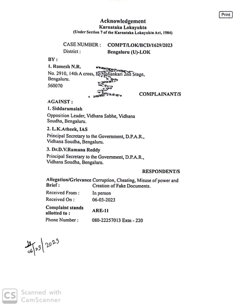 2013-14ರಿಂದ 2017-18ರ ಅವಧಿಯಲ್ಲಿ ಸಿಎಂ ಕಚೇರಿ ಹಾಗೂ ಡಿಎಪಿಆರ್ ಕಚೇರಿಯಲ್ಲಿ ಸಭೆ, ಗಣ್ಯರ ಆತಿಥ್ಯದ ಹೆಸರಿನಲ್ಲಿ ನಕಲಿ ದಾಖಲೆ ತಯಾರಿಸಿ ಹಣ ಲೂಟಿ ಆರೋಪ |ಆಗಿನ ಸಿಎಂ ಸಿದ್ದರಾಮಯ್ಯ, ಡಿಎಪಿಆರ್ ಇಬ್ಬರು ಐಎಎಸ್ ಅಧಿಕಾರಿಗಳ ವಿರುದ್ಧ ಲೋಕಾಯುಕ್ತರದಲ್ಲಿ ದೂರು ದಾಖಲಿಸಿದ ಬಿಜೆಪಿ ಮುಖಂಡ ಎನ್.ಆರ್.ರಮೇಶ್