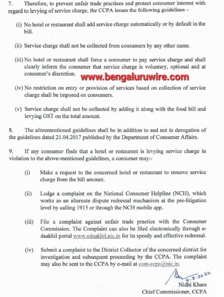 ಕೇಂದ್ರ ಗ್ರಾಹಕರ ಸಂರಕ್ಷಣಾ ಪ್ರಾಧಿಕಾರ ಈ ಹೊರಡಿಸಿದ ಮಾರ್ಗಸೂಚಿಯಲ್ಲಿ “ಹೋಟೆಲ್ಗಳು ಅಥವಾ ರೆಸ್ಟೋರೆಂಟ್ಗಳು ಸ್ವಯಂಚಾಲಿತವಾಗಿ ಅಥವಾ ಆಹಾರ ಬಿಲ್ನಲ್ಲಿ ಡೀಫಾಲ್ಟ್ ಆಗಿ ಸೇವಾ ಶುಲ್ಕವನ್ನು ಸೇರಿಸಬಾರದು ಎಂದು ಷರತ್ತು ವಿಧಿಸುತ್ತದೆ. ಯಾವುದೇ ಬೇರೆ ಹೆಸರಿನಿಂದ ಸೇವಾ ಶುಲ್ಕವನ್ನು ಸಂಗ್ರಹಿಸಬಾರದು. ಯಾವುದೇ ಹೋಟೆಲ್ ಅಥವಾ ರೆಸ್ಟೊರೆಂಟ್ ಗ್ರಾಹಕರನ್ನು ಸೇವಾ ಶುಲ್ಕ ಪಾವತಿಸಲು ಒತ್ತಾಯಿಸುವಂತಿಲ್ಲ ಮತ್ತು ಸೇವಾ ಶುಲ್ಕವು ಸ್ವಯಂಪ್ರೇರಿತ, ಐಚ್ಛಿಕ ಮತ್ತು ಗ್ರಾಹಕರ ವಿವೇಚನೆಗೆ ಒಳಪಟ್ಟಿದ್ದು, ಇದರ ಬಗ್ಗೆ ಗ್ರಾಹಕರಿಗೆ ಸ್ಪಷ್ಟವಾಗಿ ತಿಳಿಸಬೇಕು. ಸೇವಾ ಶುಲ್ಕದ ಸಂಗ್ರಹದ ಆಧಾರದ ಮೇಲೆ ಸೇವೆಗಳ ಪ್ರವೇಶ ಅಥವಾ ನಿಬಂಧನೆಗಳ ಮೇಲೆ ಯಾವುದೇ ನಿರ್ಬಂಧವನ್ನು ಗ್ರಾಹಕರ ಮೇಲೆ ವಿಧಿಸಲಾಗುವಂತಿಲ್ಲ. ಸೇವಾ ಶುಲ್ಕವನ್ನು, ಆಹಾರದ ಬಿಲ್ನೊಂದಿಗೆ ಸೇರಿಸುವ ಮೂಲಕ ಮತ್ತು ಒಟ್ಟು ಮೊತ್ತದ ಮೇಲೆ ಜಿಎಸ್ ಟಿ ವಿಧಿಸುವ ಮೂಲಕ ಸಂಗ್ರಹಿಸುಂತಿಲ್ಲ.” ಎಂದು ಸ್ಪಷ್ಟವಾಗಿ ತಿಳಿಸಿದೆ.