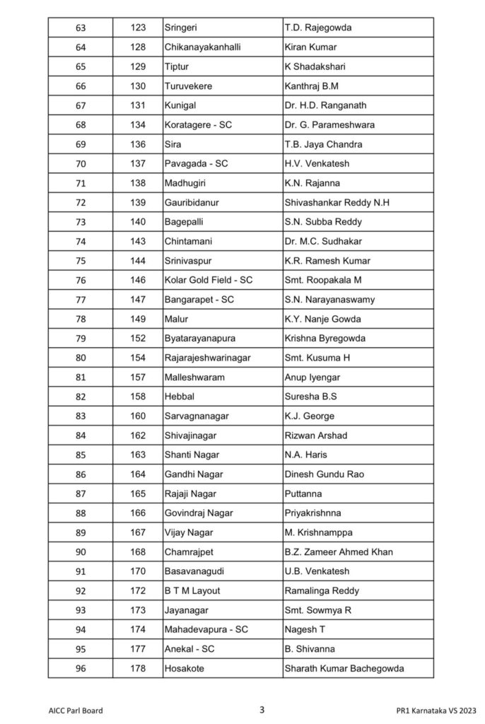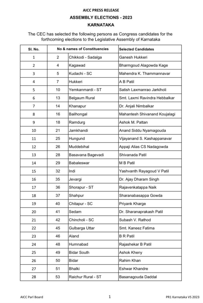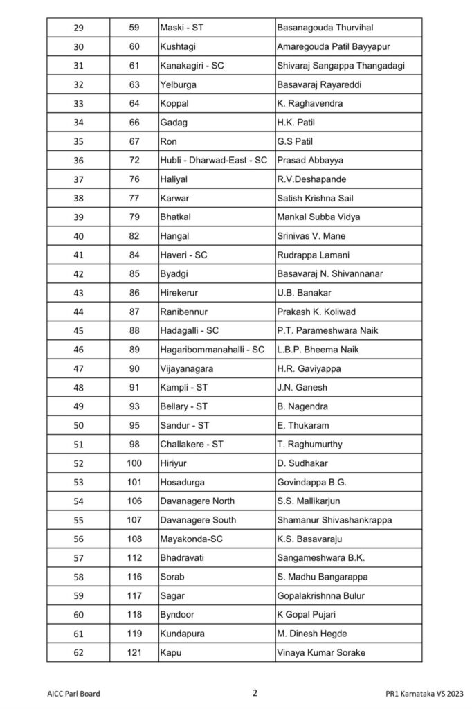 ಇನ್ನು ಪ್ರಮುಖ ನಾಯಕರಿಗೆ ಕಾಂಗ್ರೆಸ್ ಹೈಕಮಾಂಡ್ ಬಿಡುಗಡೆ ಮಾಡಿರುವ ಪಟ್ಟಿಯಲ್ಲಿ ಯಾವ ಕ್ಷೇತ್ರದಿಂದ ಸ್ಪರ್ಧಿಸುತ್ತಿದ್ದಾರೆ ಎಂಬುದನ್ನು ನೋಡಿದಾಗ, ಕಂಪ್ಲಿ -ಜೆಎನ್ ಗಣೇಶ್, ಬಳ್ಳಾರಿ ಎಸ್.ಟಿ. ಮೀಸಲು ಕ್ಷೇತ್ರ -ಬಿ. ನಾಗೇಂದ್ರ, ಸಂಡೂರು -ಈ ತುಕಾರಾಂ, ರಾಮನಗರ -ಇಕ್ಬಾಲ್ ಹುಸೇನ್, ರಾಜಾಜಿನಗರ –ಪುಟ್ಟಣ್ಣ, ಗುಂಡ್ಲುಪೇಟೆ -ಹೆಚ್.ಎಂ. ಗಣೇಶ್ ಪ್ರಸಾದ್, ಬೀದರ್ ದಕ್ಷಿಣ -ಅಶೋಕ್ ಖೇಣಿ, ಕುಣಿಗಲ್ -ಡಾ. ರಂಗನಾಥ, ಶಿರಾ -ಟಿ.ಬಿ. ಜಯಚಂದ್ರ, ಪಾವಗಡ -ಹೆಚ್.ವಿ. ವೆಂಕಟೇಶ್, ಗೋವಿಂದರಾಜನಗರ –ಪ್ರಿಯಾಕೃಷ್ಣ, ಯಮಕನಮರಡಿ -ಸತೀಶ್ ಜಾರಕಿಹೊಳಿ, ಬೆಳಗಾವಿ ಗ್ರಾಮೀಣ -ಲಕ್ಷ್ಮಿ ಹೆಬ್ಬಾಳ್ಕರ್, ರಾಮದುರ್ಗ -ಅಶೋಕ ಪಟ್ಟಣ, ಹುನಗುಂದ -ವಿಜಯಾನಂದ ಕಾಶಪ್ಪನವರ್, ಮುದ್ದೇಬಿಹಾಳ -ಅಪ್ಪಾಜಿ ನಾಡಗೌಡ, ಬಸವನ ಬಾಗೇವಾಡಿ -ಶಿವಾನಂದ ಪಾಟೀಲ್, ಬಬಲೇಶ್ವರ -ಎಂ.ಬಿ. ಪಾಟೀಲ್, ಇಂಡಿ -ಯಶವಂತರಾಯ ಗೌಡ ಪಾಟೀಲ್, ಹುಮ್ನಾಬಾದ್ -ರಾಜಶೇಖರ ಪಾಟೀಲ್, ಬೀದರ್ -ರಹಿಮ್ ಖಾನ್, ಬಾಲ್ಕಿ -ಈಶ್ವರ ಖಂಡ್ರೆ, ರಾಯಚೂರು ಗ್ರಾಮೀಣ -ಬಸವನ ಗೌಡ, ಮಸ್ಕಿ -ಬಸವನಗೌಡ ತುರವಿಹಾಳ, ಕುಷ್ಟಗಿ -ಅಮರೇಗೌಡ ಬಯ್ಯಾಪುರ, ಕನಕಗಿರಿ -ಶಿವರಾಜ್ ತಂಗಡಗಿ, ಚಾಮರಾಜಪೇಟೆ -ಜಮೀರ್ ಅಹ್ಮದ್, ಕೊರಟಗೆರೆ -ಜಿ. ಪರಮೇಶ್ವರ್, ರಾಜರಾಜೇಶ್ವರಿ ನಗರ -ಹೆಚ್. ಕುಸುಮಾ, ಶಾಂತಿನಗರ -ಎನ್.ಎ. ಹ್ಯಾರಿಸ್, ಜಯನಗರ -ಸೌಮ್ಯಾ ರೆಡ್ಡಿ, ವಿಜಯನಗರ- ಎಂ.ಕೃಷ್ಣಪ್ಪ, ಸರ್ವಜ್ಞನಗರ- ಕೆ.ಜೆ.ಜಾರ್ಜ್, ಬಸವನಗುಡಿ- ಯು.ಬಿ.ವೆಂಕಟೇಶ್ ಮೊದಲ ಪಟ್ಟಿಯಲ್ಲಿ ಸ್ಥಾನ ಪಡೆದಿದ್ದಾರೆ.