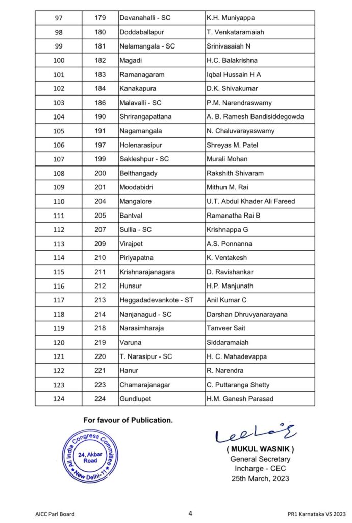 ವರುಣಾ ಕ್ಷೇತ್ರದಿಂದ ಸಿದ್ದರಾಮಯ್ಯ ಸ್ಪರ್ಧಿಸಲಿದ್ದಾರೆ. ಟಿ.ನರಸೀಪುರ ಕ್ಷೇತ್ರದಿಂದ ಹೆಚ್.ಸಿ. ಮಹದೇವಪ್ಪ, ದೇವನಹಳ್ಳಿ ಕ್ಷೇತ್ರದಿಂದ ಕೆ.ಹೆಚ್.ಮುನಿಯಪ್ಪ ಅಖಾಡಕ್ಕೆ ಇಳಿಯಲಿದ್ದಾರೆ. ನಂಜನಗೂಡು ಕ್ಷೇತ್ರದಿಂದ ಧ್ರುವನಾರಾಯಣ ಪುತ್ರ ದರ್ಶನ್ ಅವರಿಗೆ ಟಿಕೆಟ್ ಘೋಷಣೆಯಾಗಿದೆ. ಸ್ವತಂತ್ರ ಅಭ್ಯರ್ಥಿಯಾಗಿ 2018ರಲ್ಲಿ ಗೆದ್ದು ಬಂದು ಹಿಂದಿನ ಕಾಂಗ್ರೆಸ್- ಜೆಡಿಎಸ್ ಹಾಗೂ ಆನಂತರ ಬಿಜೆಪಿ ಸರ್ಕಾರದಲ್ಲಿ ಮಂತ್ರಿಯಾಗಿದ್ದ ಮುಳಬಾಗಿಲು ಶಾಸಕ ಎಚ್.ನಾಗೇಶ್ ಮಾ.14ರಂದು ತಮ್ಮ ಬೆಂಬಲಿಗರೊಂದಿಗೆ ಕಾಂಗ್ರೆಸ್ ಸೇರಿದ್ದರು. ಹಿಂದಿನ ಮುಳಬಾಗಿಲು ಕ್ಷೇತ್ರದಿಂದ ಟಿಕೆಟ್ ಬಯಸಿದ್ದ ಅವರಿಗೆ ಇದೀಗ ಕೆಪಿಸಿಸಿ ಬಿಡುಗಡೆ ಮಾಡಿರುವ ಮೊದಲ ಪಟ್ಟಿಯಲ್ಲಿ ಬೆಂಗಳೂರಿನ ಎಸ್ ಸಿ ಮೀಸಲಿರುವ ಮಹದೇವಪುರ ಕ್ಷೇತ್ರದಿಂದ ಸ್ಪರ್ಧೆಗಿಳಿಯಲು ಅವಕಾಶ ಮಾಡಿಕೊಟ್ಟಿದೆ.