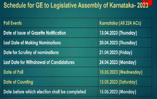 ಕೇಂದ್ರ ಚುನಾವಣಾ ಆಯೋಗದ ಮುಖ್ಯ ಚುನಾವಣಾ ಆಯುಕ್ತ ರಾಜೀವ್ ಕುಮಾರ್ ದೆಹಲಿಯ ವಿಜ್ಞಾನ ಭವನದಲ್ಲಿ ಸುದ್ದಿಗೋಷ್ಠಿಯಲ್ಲಿ ಮಾತನಾಡುತ್ತಾ ಮೇ 23 ರೊಳಗೆ ನೂತನ ವಿಧಾನಸಭೆ ಅಸ್ತಿತ್ವಕ್ಕೆ ಬರಬೇಕಿದೆ ಈ ಹಿನ್ನಲೆಯಲ್ಲಿ ಮೇ.10ರ ಬುಧವಾರಕ್ಕೆ ಒಂದೇ ಹಂತದಲ್ಲಿ ಮತದಾನ ನಡೆಯಲಿದೆ, 13ರ ಶನಿವಾರ ಮತ ಎಣಿಕೆ ನಡೆಯಲಿದೆ ಎಂದು ತಿಳಿಸಿದ್ದಾರೆ.