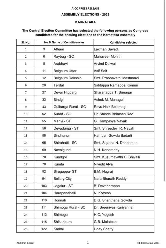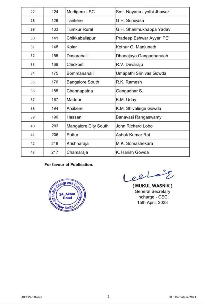 ಕಾಂಗ್ರೆಸ್ ಸಿಇಸಿ ನಂತರ ಕರ್ನಾಟಕ ಅಸೆಂಬ್ಲಿ ಚುನಾವಣೆಗೆ ಏಪ್ರಿಲ್ 6 ರಂದು 42 ಅಭ್ಯರ್ಥಿಗಳ ಎರಡನೇ ಪಟ್ಟಿಯನ್ನು ಅಂತಿಮಗೊಳಿಸಿ ಬಿಡುಗಡೆ ಮಾಡಿತು. ಇದೀಗ ಶನಿವಾರ ಮೂರನೇ ಪಟ್ಟಿ ಬಿಡುಗಡೆ ಮಾಡಿದ್ದು ಒಟ್ಟಾರೆ ಕಾಂಗ್ರೆಸ್ 209 ಅಭ್ಯರ್ಥಿಗಳ ಸಂಖ್ಯೆಯನ್ನು ಬಿಡುಗಡೆ ಮಾಡಿದಂತಾಗಿದೆ. ಅವುಗಳ ವಿವರ ಈ ಕೆಳಕಂಡಂತಿದೆ :