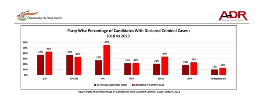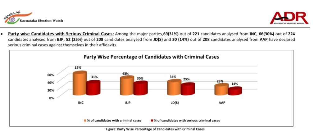 ಕರ್ನಾಟಕ ವಿಧಾನಸಭಾ ಚುನಾವಣೆ-2023 ರಲ್ಲಿ ಅಭ್ಯರ್ಥಿಗಳ ಅಪರಾಧ ಹಿನ್ನೆಲೆ, ಹಣಕಾಸು, ಶಿಕ್ಷಣ, ಲಿಂಗ ಮತ್ತು ಇತರ ವಿವರಗಳನ್ನು ವಿಶ್ಲೇಷಿಸುವ ಇತ್ತೀಚಿನ ಎಡಿಆರ್ ವರದಿಯು ಕಾಂಗ್ರೆಸ್‌ನಿಂದ 221 ಅಭ್ಯರ್ಥಿಗಳಲ್ಲಿ 69 ಅಭ್ಯರ್ಥಿಗಳು, 224 ರಲ್ಲಿ 66 ಅಭ್ಯರ್ಥಿಗಳು ಬಿಜೆಪಿಯಿಂದ, ಜೆಡಿಎಸ್ (JD(S)) 208 ರಲ್ಲಿ 52 ಅಭ್ಯರ್ಥಿಗಳು ಮತ್ತು ಆಪ್ (AAP)ಯಿಂದ ವಿಶ್ಲೇಷಿಸಲಾದ 208 ಅಭ್ಯರ್ಥಿಗಳಲ್ಲಿ 14 ಪ್ರತಿಶತದಷ್ಟು ಅಂದರೆ 30 ಅಭ್ಯರ್ಥಿಗಳು ತಮ್ಮ ಅಫಿಡವಿಟ್‌ಗಳಲ್ಲಿ ತಮ್ಮ ವಿರುದ್ಧ ಗಂಭೀರ ಕ್ರಿಮಿನಲ್ ಪ್ರಕರಣಗಳನ್ನು ಘೋಷಿಸಿದ್ದಾರೆ.