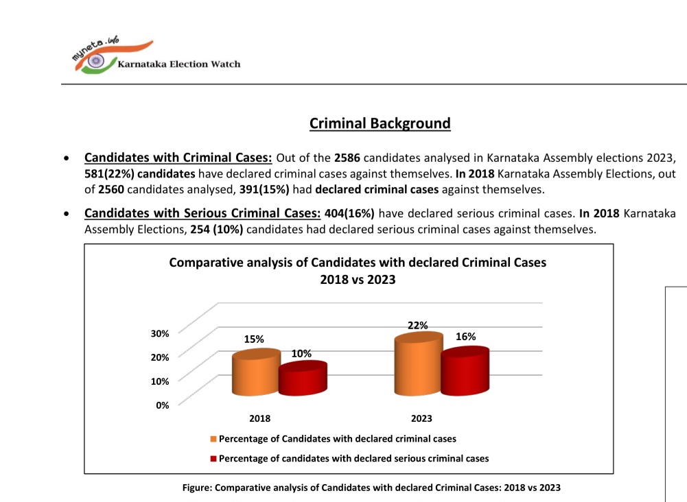 ಗಂಭೀರ ಅಪರಾಧ ಪ್ರಕರಣಗಳ ವಿಚಾರದಲ್ಲಿ 2018ರ ವಿಧಾನಸಭಾ ಚುನಾವಣೆಗೆ ಹೋಲಿಸಿದಲ್ಲಿ 2023ರ ವಿಧಾನಸಭಾ ಚುನಾವಣೆಯಲ್ಲಿ ಸ್ಪರ್ಧಿಸಿರುವ ಕ್ರಿಮಿನಲ್ ಪ್ರಕರಣ ಎದುರಿಸುತ್ತಿರುವ ಅಭ್ಯರ್ಥಿಗಳ‌ ಸಂಖ್ಯೆ ಶೇ.6ರಿಂದ ಶೇ.16ರಷ್ಟು ಹೆಚ್ಚಾಗಿದೆ ಎಂದು ಚುನಾವಣಾ ಕಾವಲು ಸಂಸ್ಥೆ ಹಾಗೂ ಅಸೋಸಿಯೇಶನ್ ಫಾರ್ ಡೆಮಾಕ್ರಟಿಕ್ ರಿಫಾರ್ಮ್ಸ್ (ಎಡಿಆರ್ -Association For Democratic Reforms) ತನ್ನ ವರದಿಯಲ್ಲಿ ತಿಳಿಸಿದೆ.