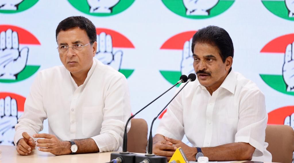 ನವದೆಹಲಿಯಲ್ಲಿ ಕೆಪಿಸಿಸಿ ಪ್ರಧಾನ ಕಾರ್ಯದರ್ಶಿ ಕೆ.ಸಿ.ವೇಣುಗೋಪಾಲ್ ಹಾಗೂ ಕರ್ನಾಟಕ ಉಸ್ತುವಾರಿ ರಣದೀಪ್ ಸಿಂಗ್ ಸುರ್ಜೇವಾಲಾ ಸುದ್ದಿಗೋಷ್ಠಿಯಲ್ಲಿ ಮಾತನಾಡುತ್ತಿರುವುದು.