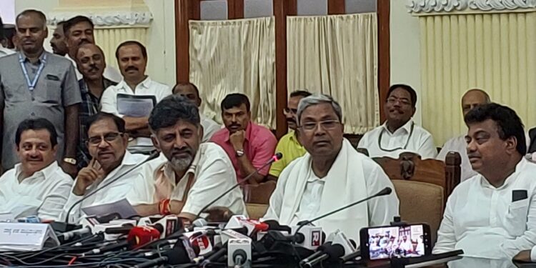 ಮುಖ್ಯಮಂತ್ರಿ ಸಿದ್ದರಾಮಯ್ಯ ಹಾಗೂ ಉಪಮುಖ್ಯಮಂತ್ರಿ ಡಿ.ಕೆ. ಶಿವಕುಮಾರ್ ಮತ್ತು ಹೊಸ ಸಂಪುಟದ 8 ಸದಸ್ಯರು ಮಧ್ಯಾಹ್ನ 12.40ಕ್ಕೆ ಕಂಠೀರವ ಕ್ರೀಡಾಂಗಣದಲ್ಲಿ ಪ್ರಮಾಣ ವಚನ ಸ್ವೀಕರಿಸಿದ ಬಳಿಕ ವಿಧಾನಸೌಧಕ್ಕೆ ಆಗಮಿಸಿ ಮೊದಲ ಸಚಿವ ಸಂಪುಟದಲ್ಲಿ ಈ ತೀರ್ಮಾನ ಕೈಗೊಂಡಿದ್ದಾರೆ.