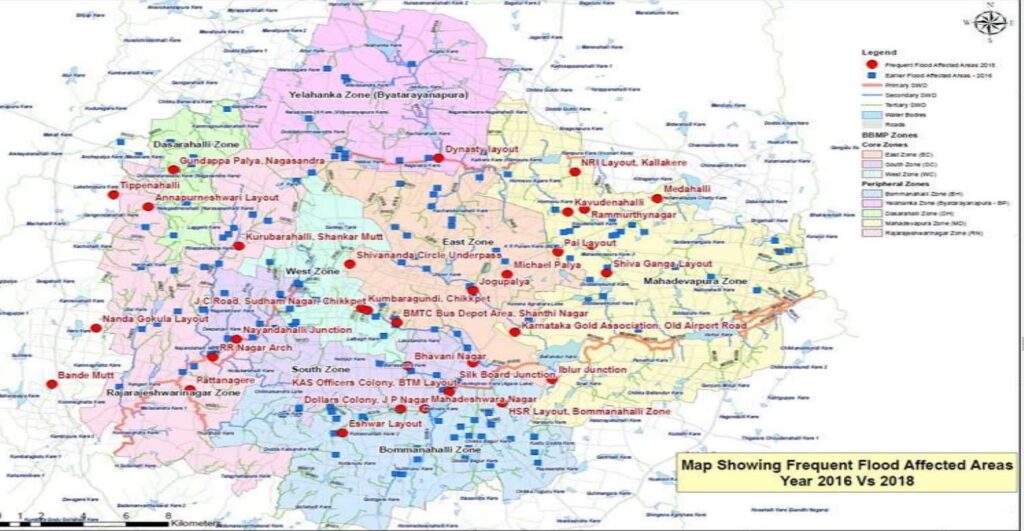 ಬೆಂಗಳೂರಿನಲ್ಲಿ 2016 ಹಾಗೂ 2018ರಲ್ಲಿ ಮಳೆಯಿಂದಾಗಿ ಪ್ರವಾಹ ಪೀಡಿತಕ್ಕೊಳಗಾದ ಸ್ಥಳಗಳನ್ನು ನಕ್ಷೆಯಲ್ಲಿ ಗುರ್ತಿಸಲಾಗಿದೆ.