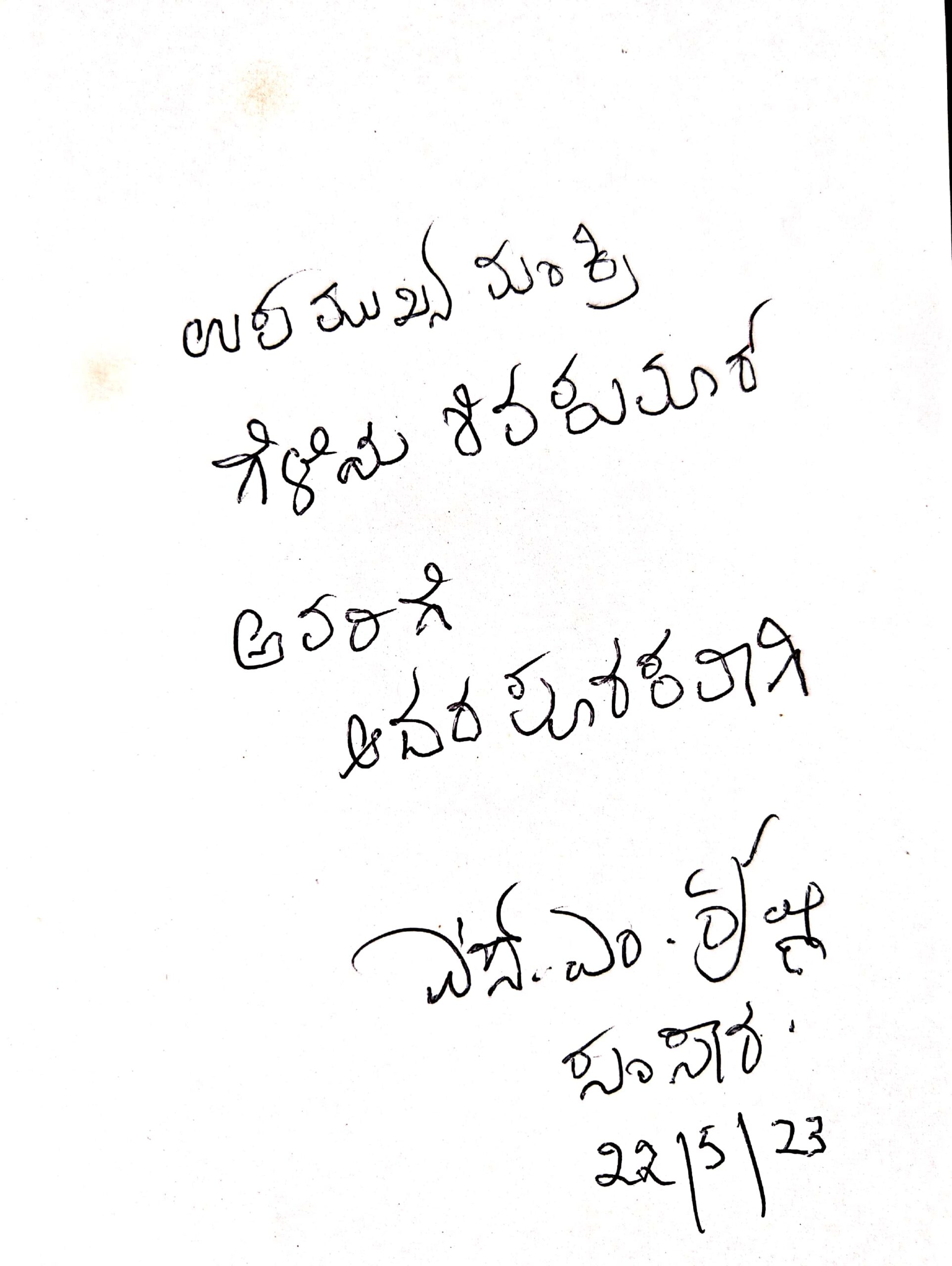 “ಉಪ ಮುಖ್ಯಮಂತ್ರಿ, ಗೆಳೆಯ ಶಿವಕುಮಾರ್ ಅವರಿಗೆ ಆದರ ಪೂರಕವಾಗಿ” ಎಂದು ಪುಸ್ತಕದಲ್ಲಿ ಎಸ್.ಎಂ.ಕೃಷ್ಣ ಅವರು ಬರೆದು ತಮ್ಮ ಸಹಿ ಹಾಕಿ ನೀಡಿದರು.